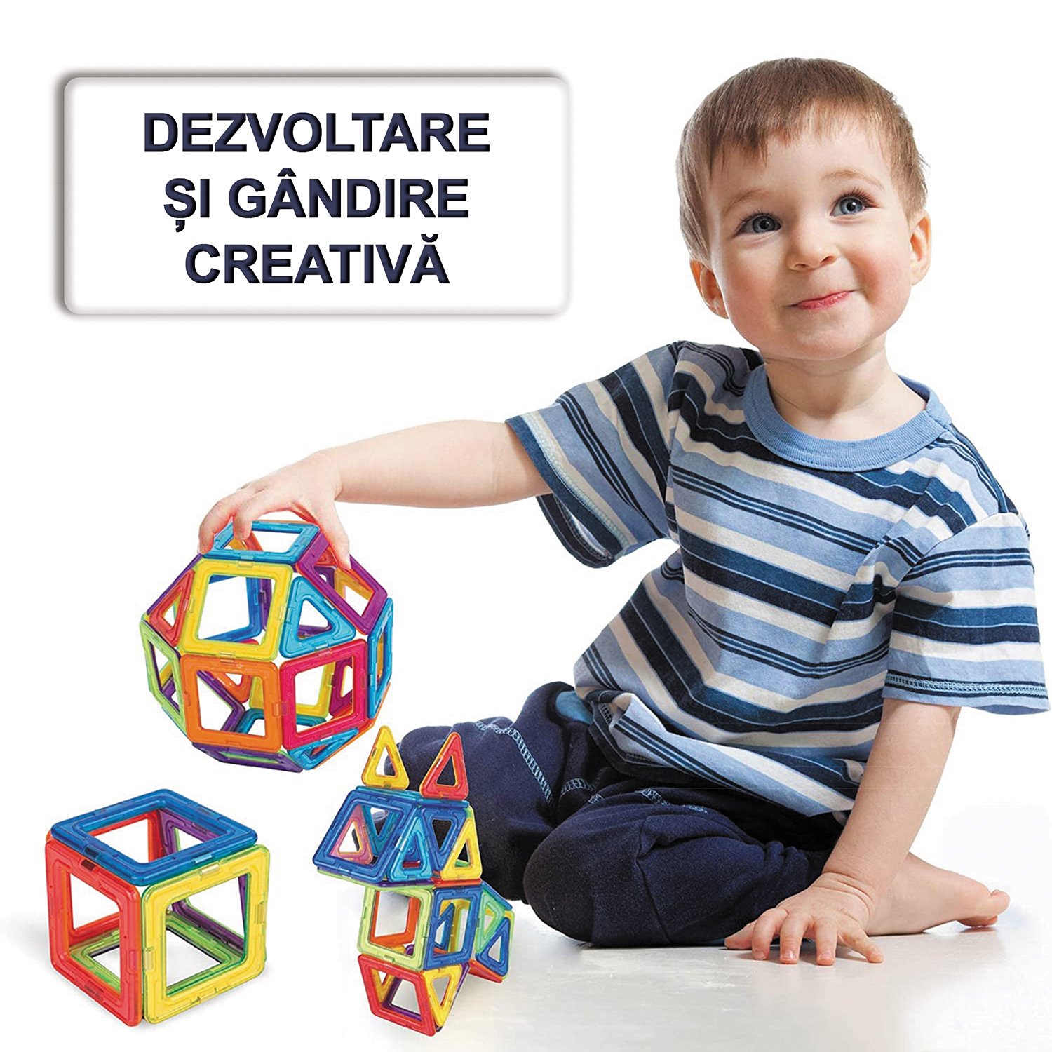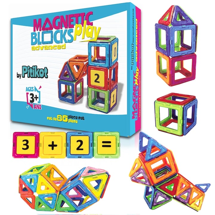 Set de construit cu piese magnetice Engros, jucarii educationale pentru copii, fete si baieti, Forme patrate, triunghiuri, litere si numere, 86 piese, Pitikot®