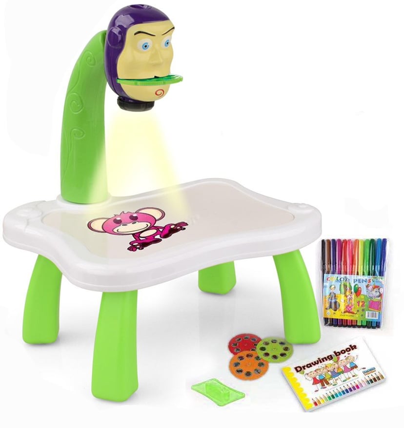 Jucarie educationala tip tabla Engros,masuta de desenat cu proiector, cu hologram, 3 discuri cu 24 sabloane si 12 carioci pentru copii, model toy story verde Pitikot®