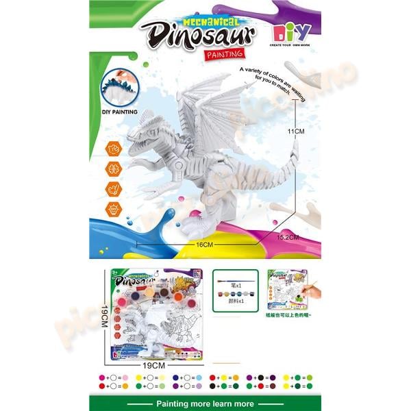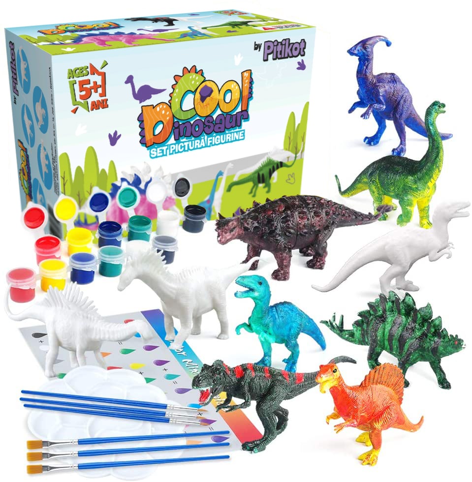 Set pictura cu 10 dinozauri de colorat Engros , cu 12 culori, 6 pensule, tavita si instructiuni, pentru fete sau baieti, copii de la 3 ani, multicolor - Pitikot®