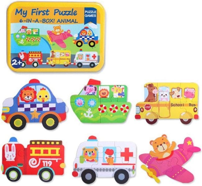 Masini 6 puzzle-uri cu piese mari in caseta metalica Engros