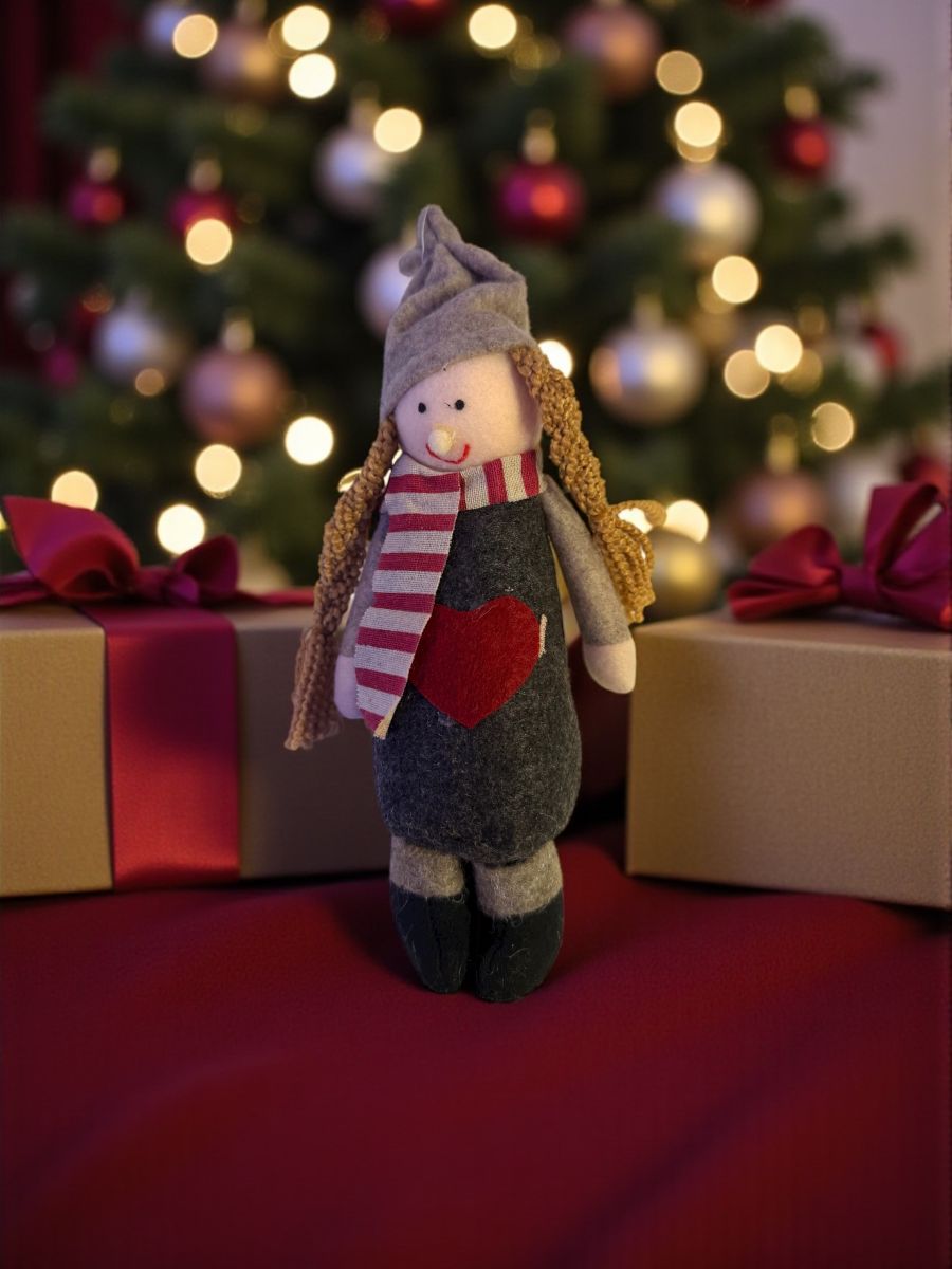 Figurină decor Crăciun fetiță textilă, 25 cm – decorațiune de iarnă cu inimă roșie,En-gros