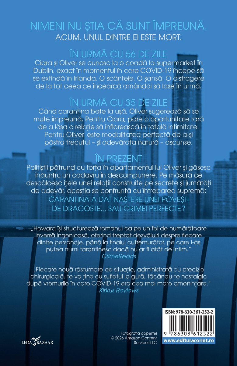 #html-body [data-pb-style=ECXTJGO]{justify-content:flex-start;display:flex;flex-direction:column;background-position:left top;background-size:cover;background-repeat:no-repeat;background-attachment:scroll}Nimeni nu știa că sunt împreună. Acum, unul dintre ei este mort. ÎN URMĂ CU 56 DE ZILE Ciara și Oliver se cunosc la o coadă la supermarket în Dublin, exact în momentul în care COVID-19 începe să se extindă în Irlanda. O scânteie. O șansă. O distragere de la tot ceea ce încearcă amândoi să lase în urmă. ÎN URMĂ CU 35 DE ZILE Când carantina bate la ușă, Oliver sugerează să se mute împreună. Pentru Ciara, pare o oportunitate rară de a lăsa o relație să înflorească în totală intimitate. Pentru Oliver, este modalitatea perfectă de a-și păstra trecutul – și adevărata natură – ascunse. ÎN PREZENT Polițiștii pătrund cu forța în apartamentul lui Oliver și găsesc înăuntru un cadavru în descompunere. Pe măsură ce descâlcesc ițele unei relații construite pe secrete și jumătăți de adevăr, aceștia se confruntă cu întrebarea supremă: carantina a dat naștere unei povești de dragoste… sau crimei perfecte? „Howard își structurează romanul ca pe un fel de numărătoare inversă ingenioasă, oferind treptat dezvăluiri despre fiecare dintre personaje, până la finalul cutremurător, pe care l-aș putea numi tarantinesc dacă nu ar fi atât de intim.” CrimeReads „Fiecare nouă răsturnare de situație, administrată cu precizie chirurgicală, te va ține cu sufletul la gură, făcându-te nostalgic după vremurile în care COVID-19 era cea mai mare amenințare.” Kirkus Reviews „Criminal de bun!” The New York Times „Actual, surprinzător, plin de viață din punct de vedere emoțional; este tot ce poate fi mai bun în literatura de suspans.” Washington Post „56 de zile este un roman terifiant, scris de o autoare care a devenit cu siguranță o voce remarcabilă în literatura crime. Nu o să mai poți lăsa cartea din mână.” KARIN SLAUGHTER, autoarea bestsellerului Frânturi din ea „Catherine Ryan Howard duce literatura crime la un nou nivel.” SAM BLAKE, autoarea bestsellerului Little Bones „56 de zile este alegerea sigură pentru iubitorii de thrillere care tânjesc după fire narative pline de suspans. Catherine Ryan Howard este o maestră a genului!” Fresh Fiction „Întunecat și strălucitor, amuzant, sinistru și extrem de inteligent. Am citit 56 de zile cu sufletul la gură până la ultimele pagini hipnotizante. Catherine Ryan Howard este incredibil de talentată.” CHRIS WHITAKER, autorul bestsellerului Începem cu sfârșitul „O lectură captivantă! Pe măsură ce legătura dintre idila aparent simplă, și totuși complexă, a cuplului și crimă devine tot mai clară prin poveștile de fundal dozate cu grijă, cititorii se vor trezi ținându‑le pumnii acestor personaje imperfecte. Howard continuă să impresioneze.” Publishers Weekly