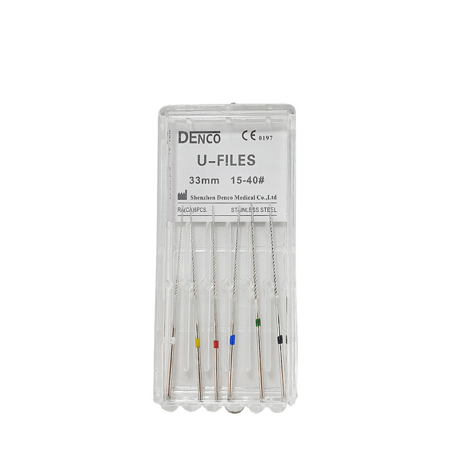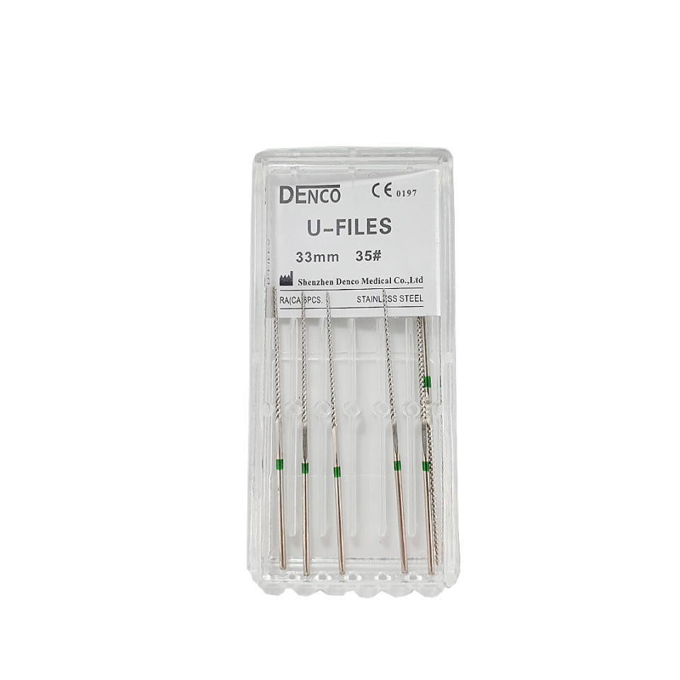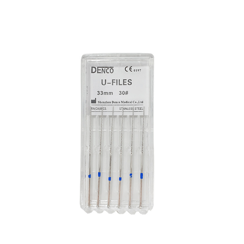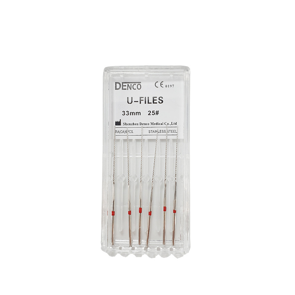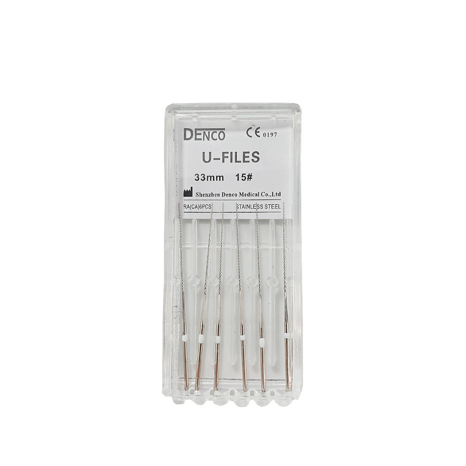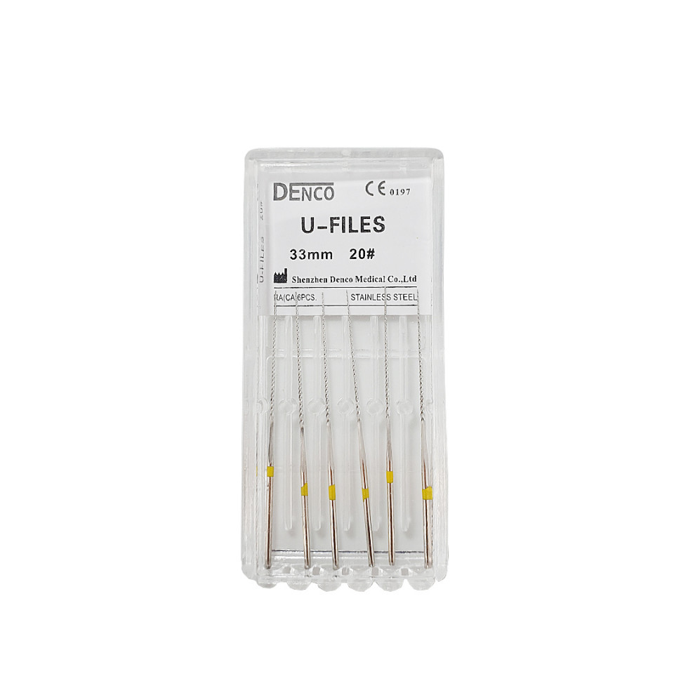 Ac canal U FILES este un ac dentar cu sistem de prindere utilizat pentru marirea canalului radicular. Este folosit cu miscari verticale. Este un instrument nesteril. Produs sterilizabil in autoclav. Partea de taiere este din otel inoxidabil (inclusiv nichel și crom), iar manerul din polibutilen tereftalatul (PBT). Lungime: 33 mm Prezentare: 6 ace. Pretul afisat este per cutie.