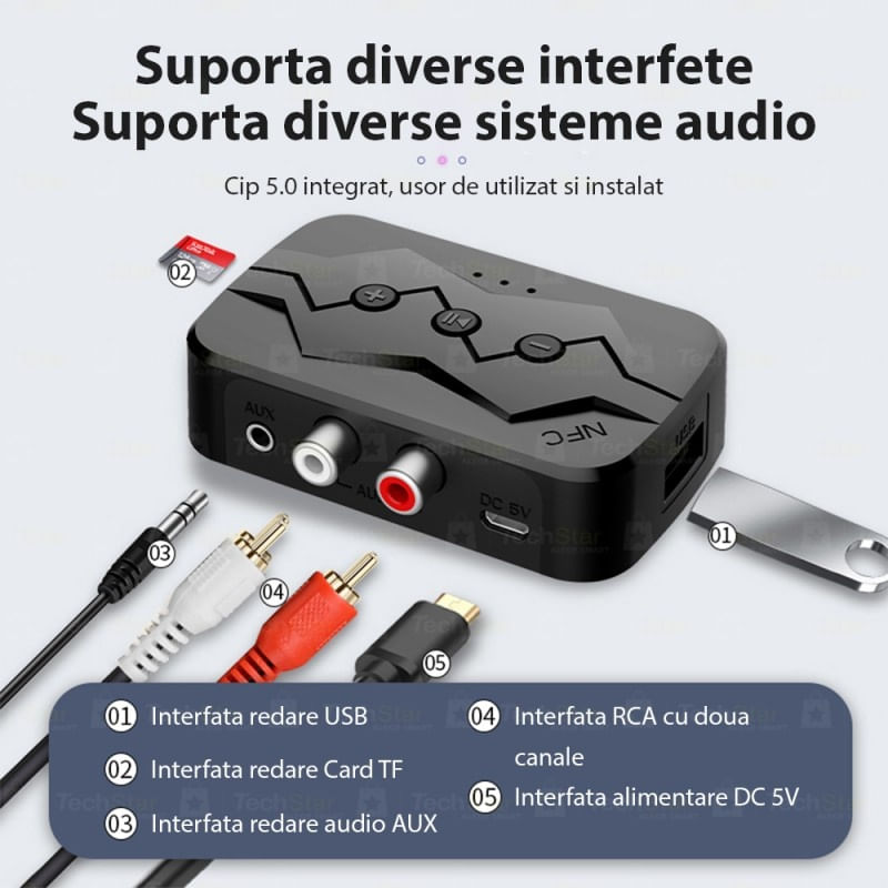 Adaptor Bluetooth Techstar® M23 cu versiune Bluetooth 5.0 poate fi conectat la orice receptor A/V si orice difuzoare alimentate cu mufa standard de 3,5 mm sau porturi 2RCA, este compatibil pentru sisteme home theater, sisteme stereo, si stereo auto, potrivite si pentru iPhone, iPad, iPod Touch, telefoane inteligente si dispozitive Android.Cipul incorporat: va puteti conecta direct cu telefonul mobil NFC sau alt dispozitiv Bluetooth NFC compatibil prin atingerea acestui receptor.Functionalitate puternica: suport card Micro SD, Memorie USB Flash, conexiune NFC, apel hands-free, transmisie audio Bluetooth.Suporta portul audio dublu pentru conectare: Vine cu portul audio de 3,5 mm si 2RCA, potrivit pentru mai multe dispozitive (cablu de 3,5 mm si cablu 2RCA incluse).Conexiune wireless cu raza lunga de actiune: Adaptorul Bluetooth accepta conexiunea pana la 10 metri, controland redarea muzicii la distante lungi. Cipul BT 5.0 incorporat, accepta cu usurinta toate tipurile de echipamente audio, plug and play. Echipat cu taste multifunctionale, modul de comutare cu o singura tasta, reduce operatiunile obositoare, accepta redarea/pauza/taierea muzicii/volumul/modul.Specificatii: Model: MSD-M23 Dimensiune: 8*5.5*2CM Material: ABS Bluetooth: BT 5.0 Distanta: 10M Sursa de alimentare: DC5V (1-2.1A)Pachetul include: 1x transmitator receptor Bluetooth 1x cablu audio de 3,5 mm 1x cablu audio 2RCA 1x cablu de incarcare micro usb 1x manual de utilizare.