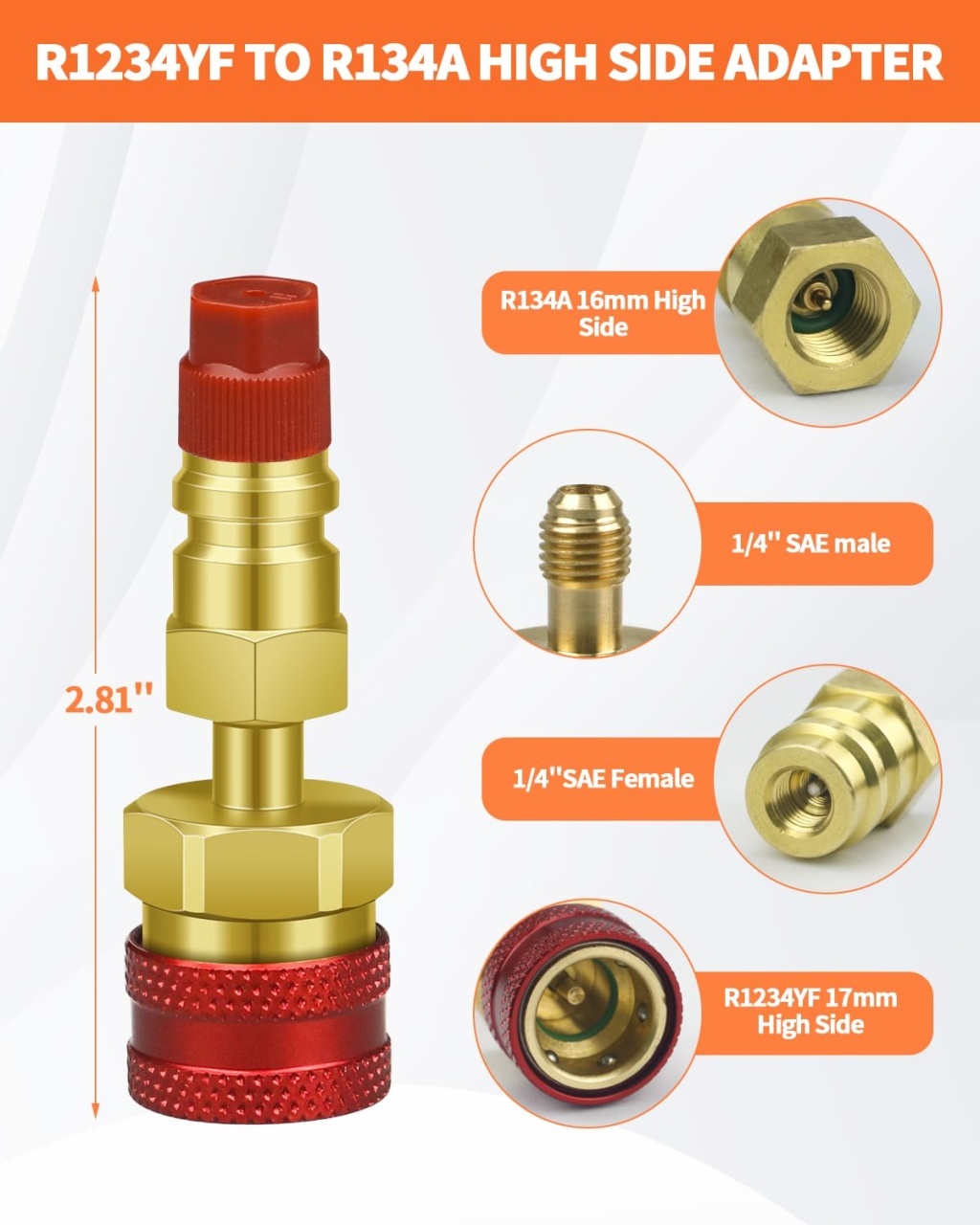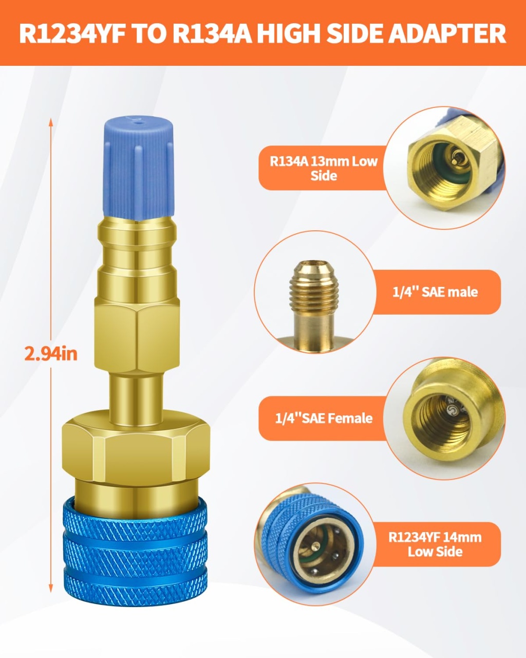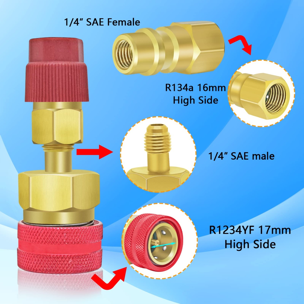 Adaptor rapid R1234yf la R134a, set 2 cuple rapide pentru instalatiile de aer conditionat auto. Permite conectarea furtunurilor si a ceasurilor AC cu racord 1/4 SAE la porturile moderne R1234yf, astfel incat sa poti folosi aceeași statie sau kit de incarcare pentru mai multe tipuri de agent frigorific. Caracteristici principale: Set complet: 1 adaptor Low Side albastru si 1 adaptor High Side rosu Compatibil cu porturi service R1234yf (14 mm low, 17 mm high) si R134a (13 mm low, 16 mm high) prin adaptoarele incluse Racord standard 1/4 SAE (male/female) pentru furtunuri AC, manometre si stații de incarcare Corp din alama masiva / aluminiu cupru, rezistent la coroziune si presiune ridicata Mecanism de cuplare rapida cu functie de inchidere automata pentru prevenirea pierderilor de freon Textura striata a piulitelor asigura prindere buna cu mana, usurand montarea si demontarea Ideal pentru incarcare, recuperare, vidare si diagnostic sisteme AC cu agenti R1234yf, R134a (si R12 unde este cazul) in service-uri auto sau garaj personal Specificatii: Dimensiune adaptor: aproximativ 7,3 x 1,6 cm Culori: rosu (high side) si albastru (low side) Utilizare recomandata cu refrigerant R1234yf si set manifold AC dedicat auto