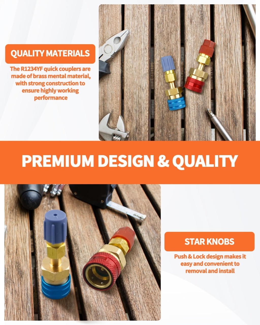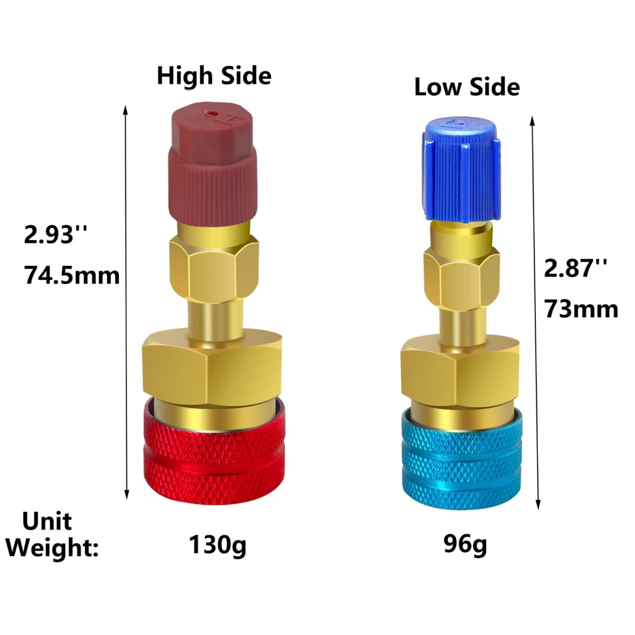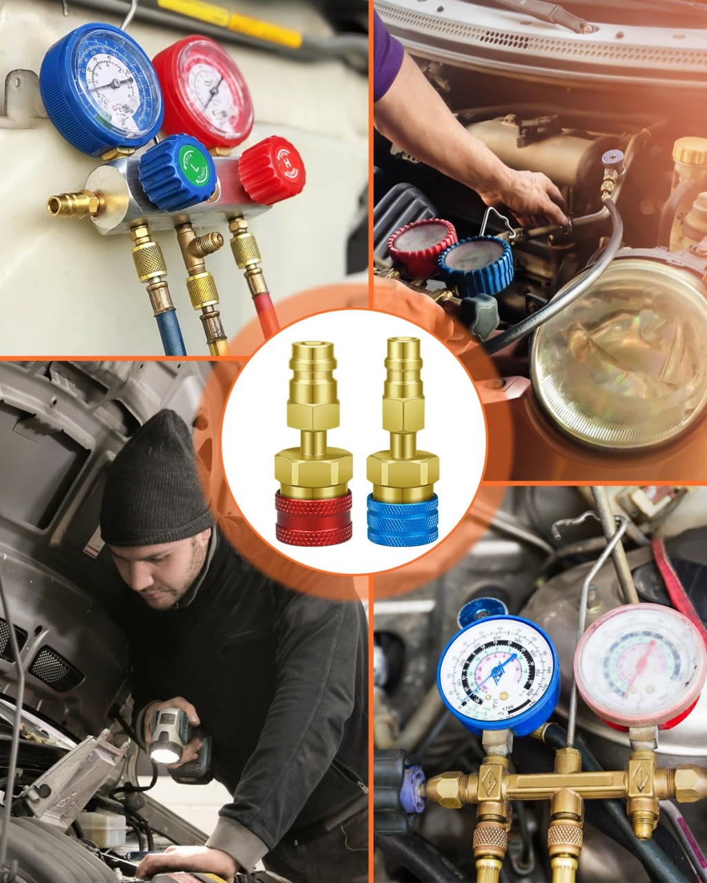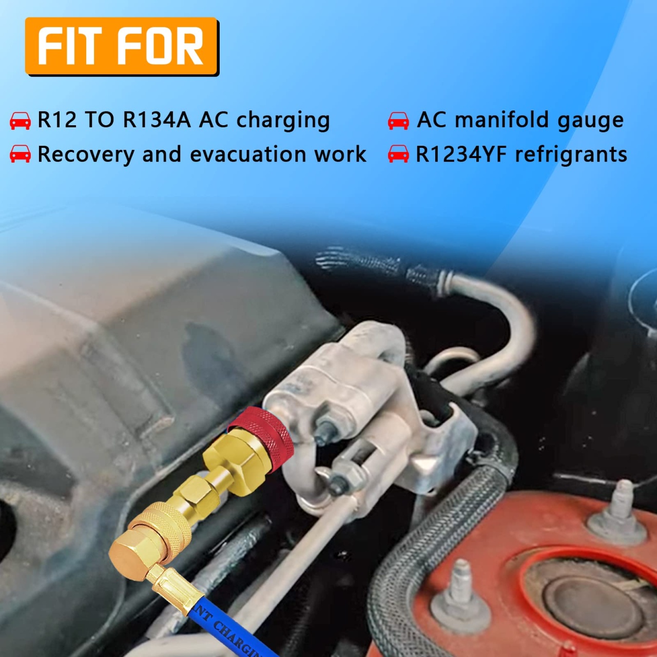 Adaptor rapid R1234yf la R134a, set 2 cuple rapide pentru instalatiile de aer conditionat auto. Permite conectarea furtunurilor si a ceasurilor AC cu racord 1/4 SAE la porturile moderne R1234yf, astfel incat sa poti folosi aceeași statie sau kit de incarcare pentru mai multe tipuri de agent frigorific. Caracteristici principale: Set complet: 1 adaptor Low Side albastru si 1 adaptor High Side rosu Compatibil cu porturi service R1234yf (14 mm low, 17 mm high) si R134a (13 mm low, 16 mm high) prin adaptoarele incluse Racord standard 1/4 SAE (male/female) pentru furtunuri AC, manometre si stații de incarcare Corp din alama masiva / aluminiu cupru, rezistent la coroziune si presiune ridicata Mecanism de cuplare rapida cu functie de inchidere automata pentru prevenirea pierderilor de freon Textura striata a piulitelor asigura prindere buna cu mana, usurand montarea si demontarea Ideal pentru incarcare, recuperare, vidare si diagnostic sisteme AC cu agenti R1234yf, R134a (si R12 unde este cazul) in service-uri auto sau garaj personal Specificatii: Dimensiune adaptor: aproximativ 7,3 x 1,6 cm Culori: rosu (high side) si albastru (low side) Utilizare recomandata cu refrigerant R1234yf si set manifold AC dedicat auto