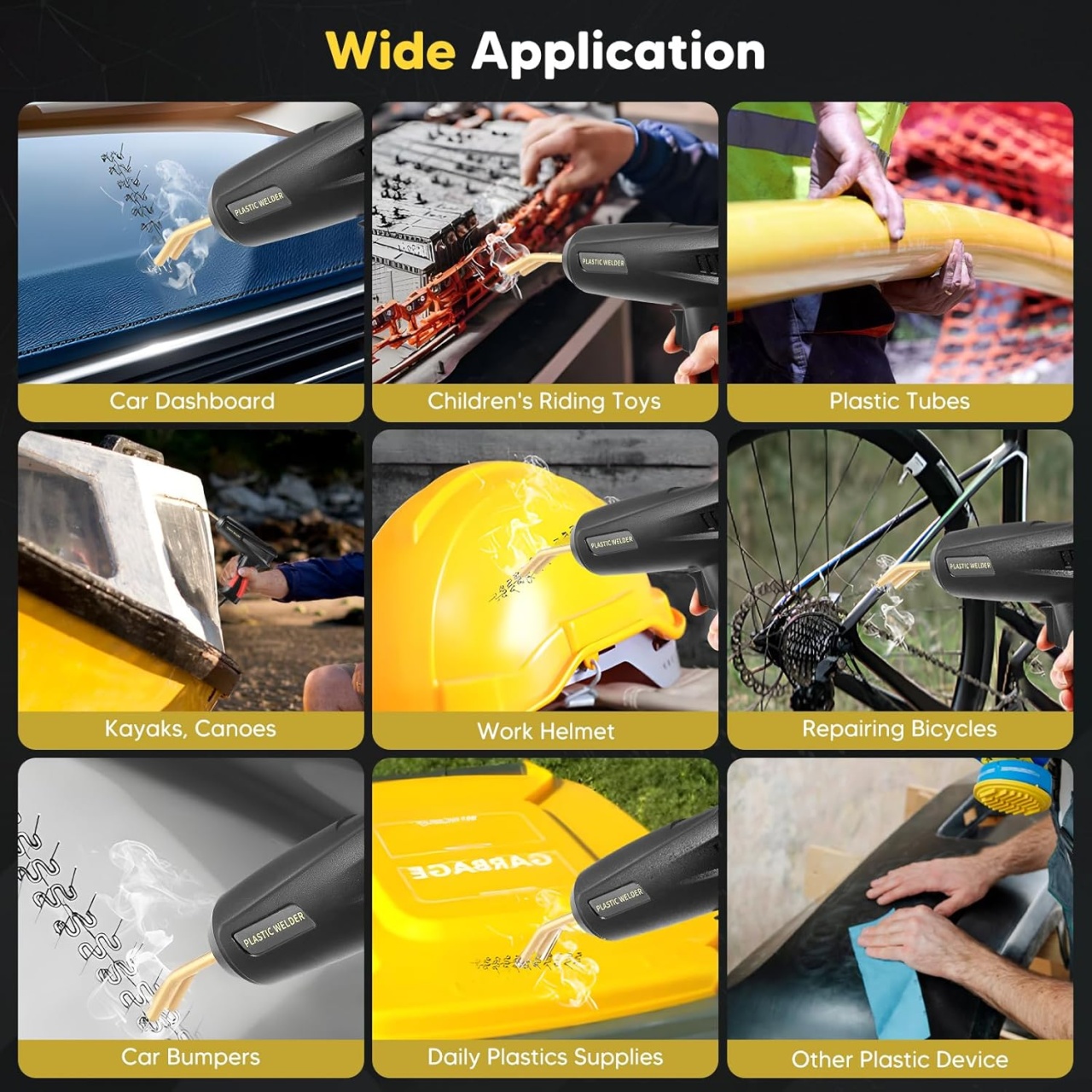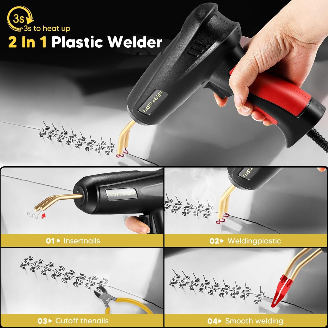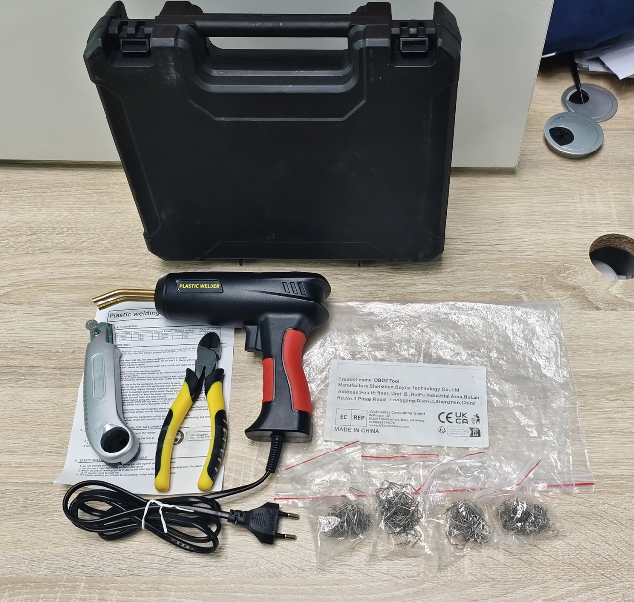 Aparat de sudura plastic 200W – Plastic Welder 2 in 1, cu capse termice, set complet in cutie Aparatul de sudura plastic 200W este un instrument electric multifunctional, destinat repararii rapide si durabile a componentelor din plastic . Functioneaza prin incalzirea capselor metalice (hot staples), care sunt inserate in plastic pentru a consolida fisurile si crapaturile, urmate de netezire si finisare. Este ideal pentru bare auto, carene, carcase, panouri, jucarii, tevi din plastic si alte piese din materiale termoplastice . Avantaje principale ? Putere 200W – incalzire rapida in 1–3 secunde ? Sistem 2 in 1 : predominare cu capse + netezire plastic ? Iluminare LED integrata pentru lucru in zone slab iluminate ✋ Design ergonomic, sigur in utilizare ⚡ Reparatie rapida, fara adezivi ? Set complet, gata de utilizare Functii aparat Sudura plastic fara adaos Fixare fisuri cu capse termice Reparare crapaturi drepte, curbate, interioare si exterioare Netezire si finisare suprafata Taiere termica a plasticului (functie auxiliara) Consolidare structura piesei reparate Tipuri de capse incluse (200 bucati total) ✔ Small wave (50 buc.) – pentru fisuri fine sau drepte ✔ Large wave (50 buc.) – pentru fisuri mari sau curbate ✔ V-shaped (50 buc.) – pentru colturi interioare ✔ M-shaped (50 buc.) – pentru colturi exterioare Capsele sunt fabricate din metal rezistent la temperatura, pentru o sudura ferma si durabila. Aplicatii uzuale Bare auto si elemente caroserie Borduri si componente interioare auto Jucarii pentru copii Tevi si carcase din plastic Caiace, canoe Casti de protectie Biciclete (elemente din plastic) Produse din plastic pentru uz casnic Specificatii tehnice Putere: 200W Alimentare: 220–240V AC Incalzire: 1–3 secunde Tip sudura: capse termice + topire plastic Iluminare: LED Utilizare: reparatii plastic Continut pachet (set complet) ? 1 x Aparat sudura plastic 200W ? 1 x Cleste taiere capse ? 1 x Cutit pentru finisare plastic ? 200 x Capse termice (4 tipuri x 50 buc.) ? 1 x Cutie de depozitare neagra Mod de utilizare (pe scurt) Introdu capsa dorita in varful aparatului Incalzeste plasticul si fixeaza capsa in zona fisurata Lasa sa se raceasca aprox. 45 secunde Taie excesul de capsa Netezeste suprafata pentru finisaj Informatii de siguranta Utilizati doar pe materiale termoplastice Nu atingeti varful incins Nu utilizati in medii umede A nu se lasa la indemana copiilor Recomandat utilizatorilor cu varsta peste 18 ani