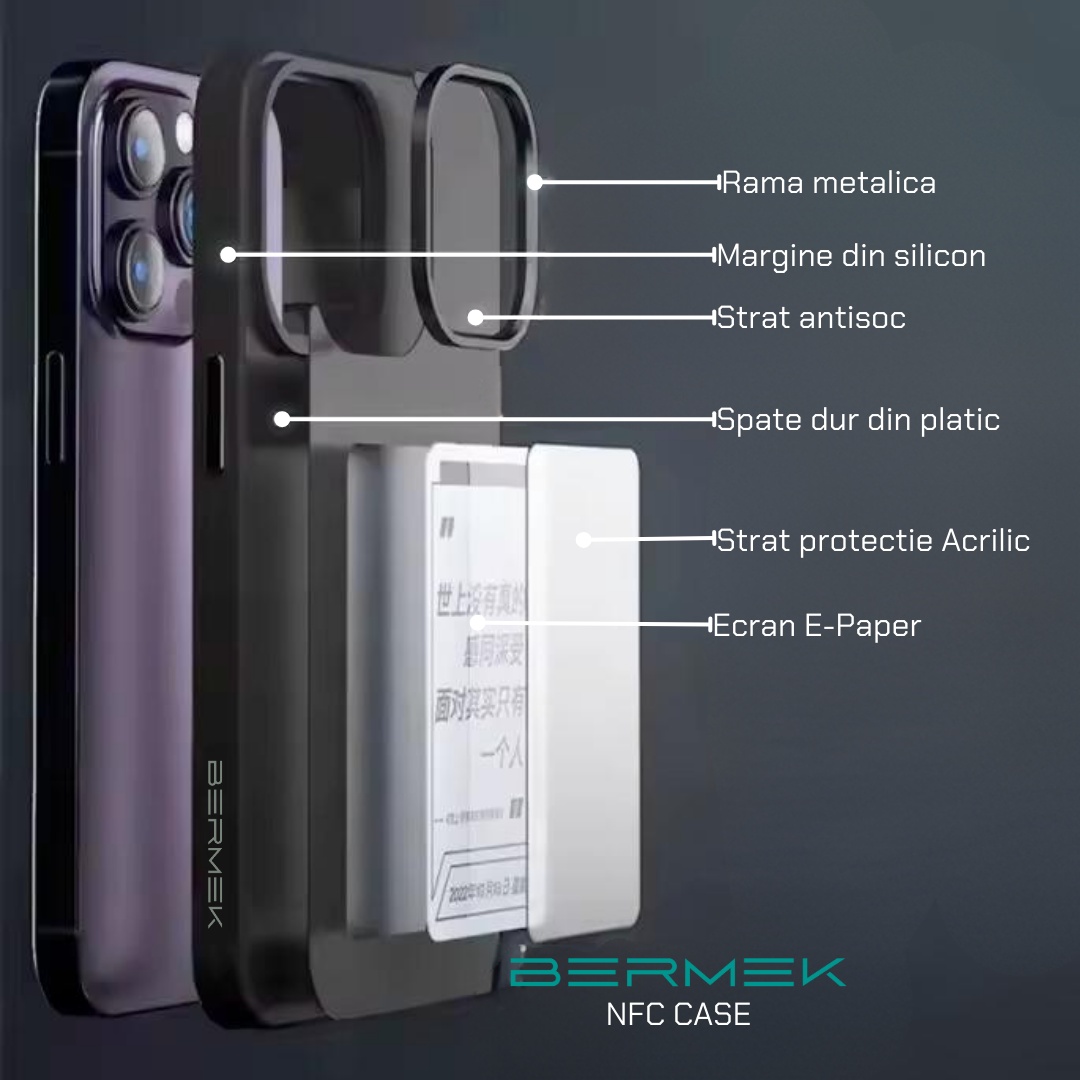 Descoperă Noua Husă Bermek cu ecran pentru iPhone 14 Pro Max– Inovație și Stil într-un Singur Accesoriu Transformă-ți telefonul într-o adevărată operă de artă cu noua noastră husă echipată cu ecran E-Ink. Fie că vrei să afișezi o imagine dragă, un citat motivator sau programul zilei, husa Bermek îți pune creativitatea în valoare și te ajută să te exprimi în cel mai original mod. Conectivitate NFC Eficientă Husa folosește tehnologia NFC pentru a se alimenta, eliminând orice griji legate de consumul bateriei. Fără baterii suplimentare și fără necesitatea reîncărcării, te bucuri de comoditate maximă și un impact minim asupra duratei de viață a bateriei telefonului tău. Vizualizare Optimă cu E-Ink Ecranul E-Ink asigură o vizualizare plăcută, oferind imagini clare în trei culori. Actualizările de display se fac rapid, în doar 13 secunde, permițându-ți să schimbi conținutul după preferințe fără întârziere. Protecție Certificată și Montare Precisă Realizată din materiale durabile – PC, silicon și sticlă – husa este concepută să protejeze telefonul tău împotriva căzăturilor și zgârieturilor. Designul său precis asigură acces ușor la toate butoanele și porturile telefonului, fără a compromite funcționalitatea. Fiecare husă vine completată cu o folie de sticlă pentru protecție suplimentară. Ușor de Utilizat Pur și simplu plasează telefonul în husa Bermek pentru a conecta automat prin NFC. Descarcă aplicația Ink Show, adaugă imagini sau texte, și actualizează instantaneu aspectul husei tale. Cu husa Bermek pentru iPhone 14 Pro Max, stilul tău personal este întotdeauna la vedere. Alege să te exprimi în fiecare zi într-un mod nou și captivant! Specificații Tehnice: Dimensiune Ecran: 3.7 inch Rezoluție Ecran: 240(H) x 416(V) pixeli Afișaj: Ecran E-Ink în 4 culori UPGRADAT Compatibilitate: iPhone 14 Pro Max Materiale: Policarbonat (PC), Silicon, Sticlă Conținut pachet: 1 x Husă telefon 1 x Folie sticlă 1 x Organizator cabluri Bermek