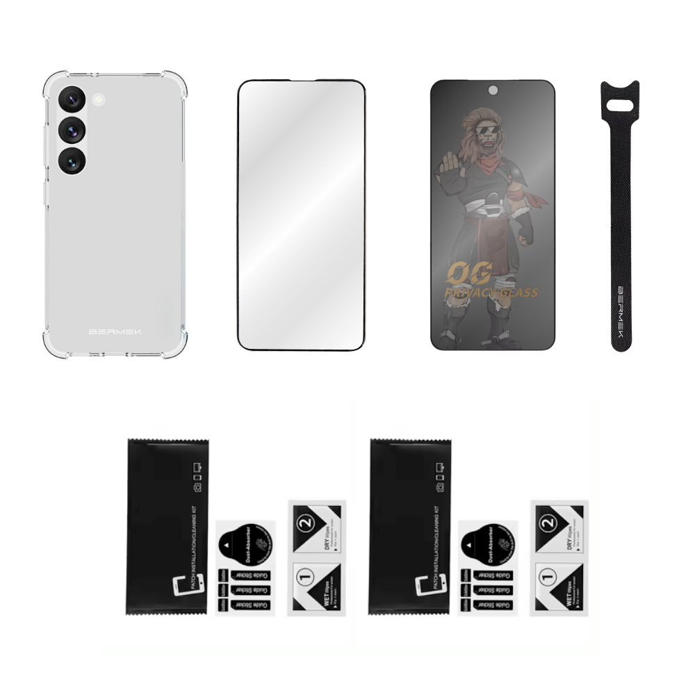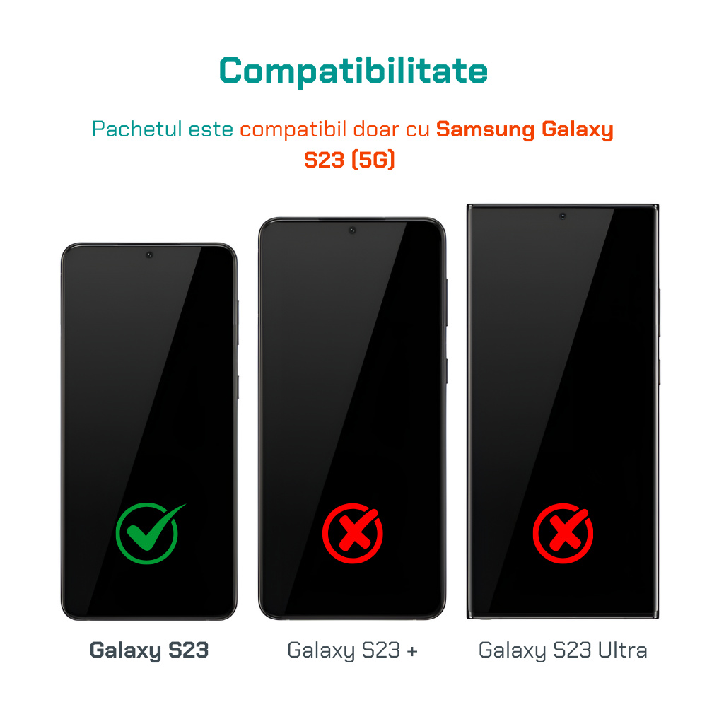 Set Complet de Accesorii de la Bermek pentru Samsung Galaxy S23 - Protecție și Organizare Asigură-te că telefonul tău Samsung Galaxy S23 rămâne în condiții optime cu acest set complet de accesorii de la Bermek, special conceput pentru siguranța și comoditatea ta. Husa antișoc subțire, transparentă, cu colțuri întărite pentru absorbția șocurilor, protejează împotriva căzăturilor și impacturilor. Designul său minimalist nu adaugă volum suplimentar, păstrând linia elegantă a telefonului. Folia transparentă asigură o protecție superioară împotriva zgârieturilor și impacturilor, fără a afecta sensibilitatea touchscreen-ului sau claritatea ecranului. Folia de protecție privacy limitează unghiul de vizualizare al ecranului, protejându-ți informațiile personale de privirile indiscrete în locuri aglomerate. Organizatorul de cabluri cu velcro te ajută să îți menții cablurile organizate și accesibile. Este simplu de utilizat și extrem de funcțional. Cutia reutilizabilă din metal este durabilă și perfectă pentru depozitare. Cu acest set complet, telefonul tău Samsung Galaxy S23 va fi protejat și gata de orice provocări! Specificații tehnice: Compatibilitate: Samsung Galaxy S23 Husă: Material: Silicon Grosime: 0.3 mm Folie de Protecție: Material: Sticlă temperată Duritate: 9H Conținut pachet: 1 x Husa 1 x Folie transparenta 1 x Folie privacy 1 x Organizator cabluri 2 x Kit de curățare