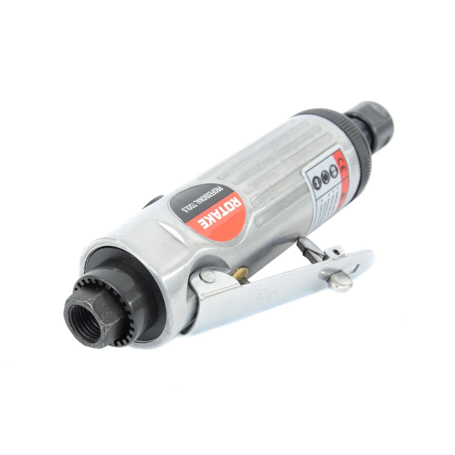 BIAX Rotake RT-1206 6mm pneumatic Masina de tocat pneumatica profesionala. A fost confectionat din materiale de cea mai buna calitate are o incuietoare pentru a preveni pornirea nepasatoare. Rasnita functioneaza cu pietre de slefuit cu diametru de 6mm. Este folosit de profesionisti precum si de pasionati. Avantaje: - Design solid durabil ergonomic - Cerere redusa de aer Date tehnice: - Viteza maxima: 22.000 rpm - Filet de racord aer: 1/4 - Functioneaza cu pietre: 6mm - Consumul de aer: ~ 113 l / min - Lungime: 172mm