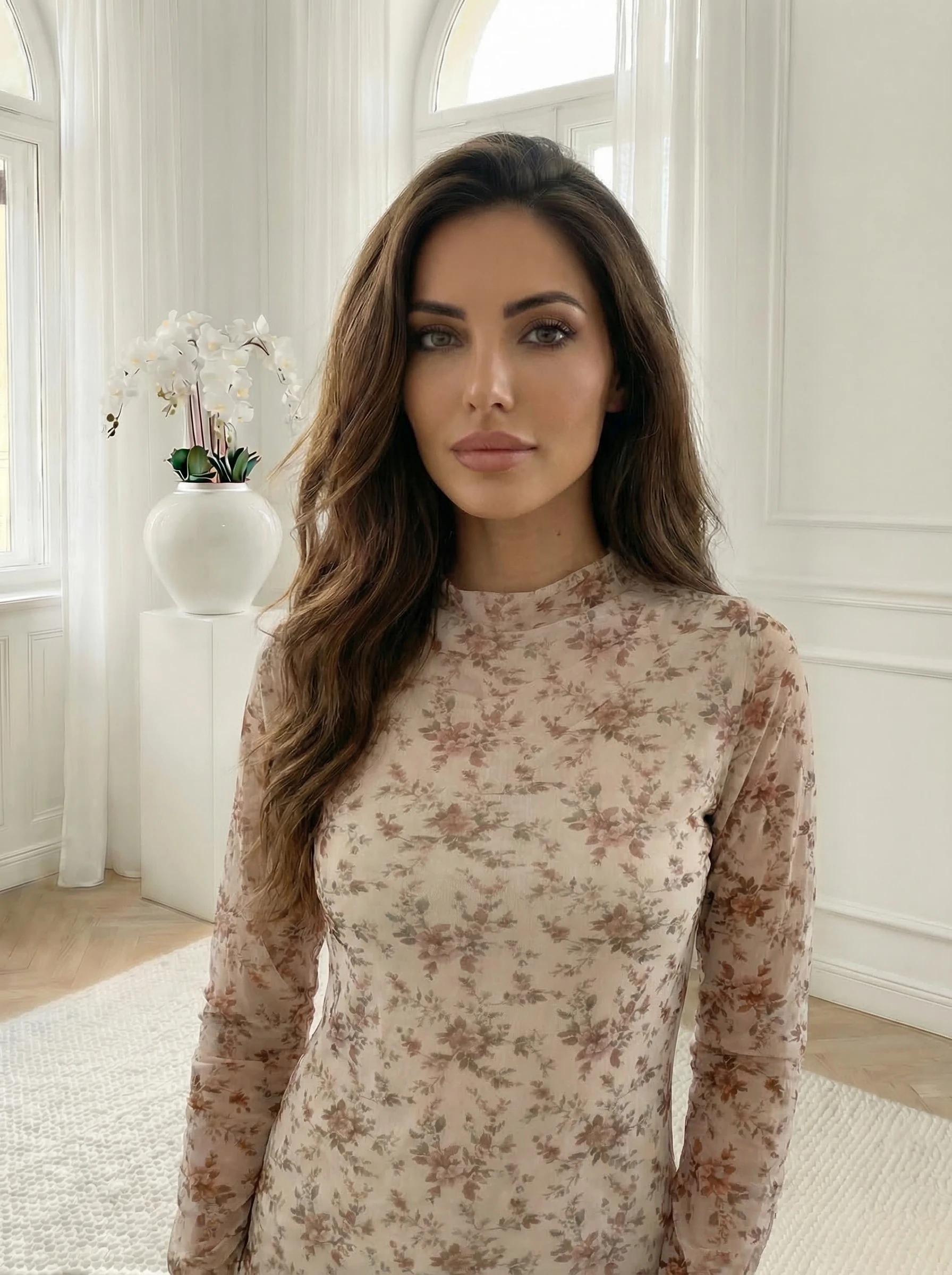 Bluza eleganta bej din tul cu imprimeu floral si guler inalt, o piesa delicata si moderna, creata pentru a aduce un plus de finete oricarei garderobe. Confectionata dintr-un material tip plasa, usor si elastic, aceasta ofera o transparenta discreta pe man