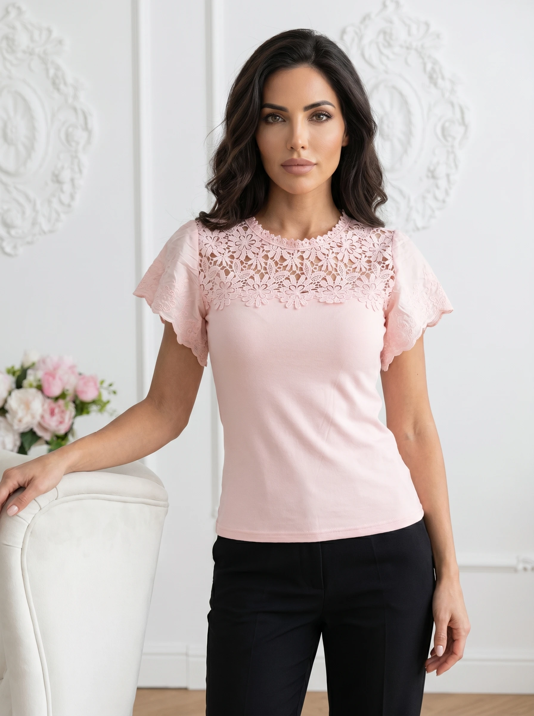 Bluza eleganta din bumbac cu dantela si maneci fluture, care adauga o nota de rafinament si feminitate tinutelor, ideala pentru un look sofisticat de zi sau pentru o ocazie speciala. Piesa se remarca prin detaliul pretios de dantela guipure din zona decol