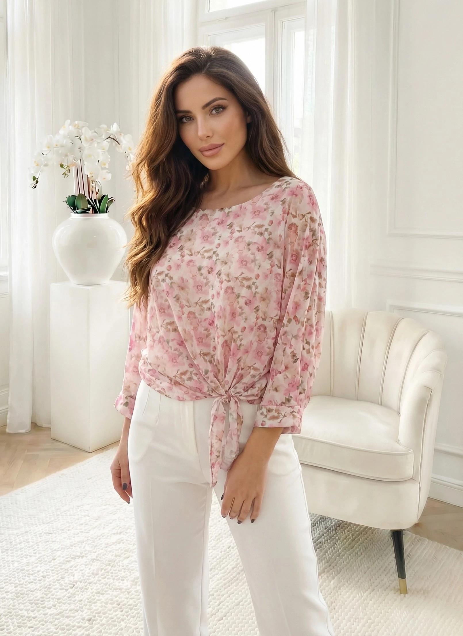 Bluza eleganta roz cu imprimeu floral si nod decorativ, o piesa vestimentara delicata si feminina, conceputa dintr-un material usor si vaporos care ofera un aspect romantic oricarei tinute. Aceasta piesa este prevazuta cu captuseala atat pe fata, cat si p