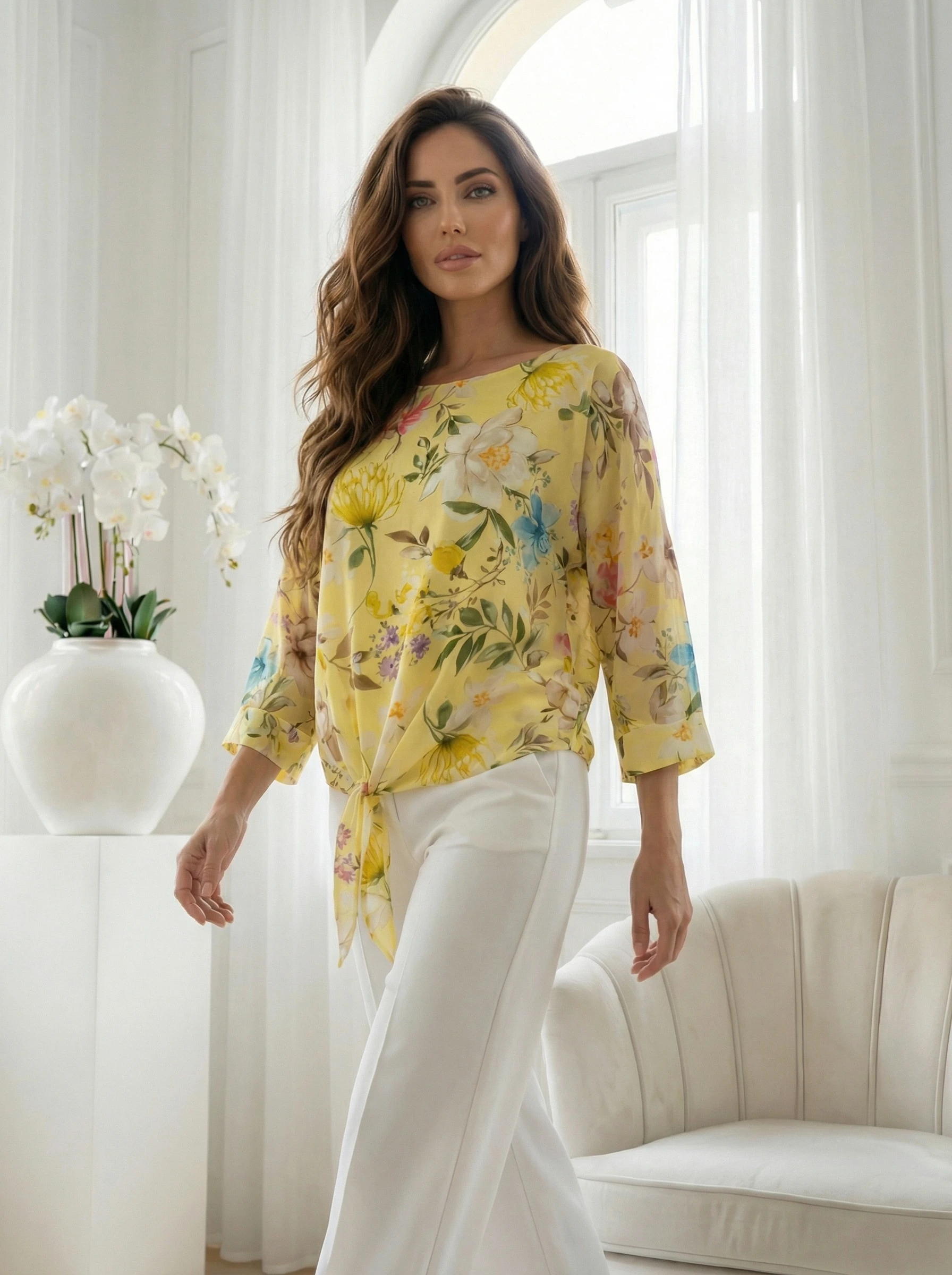 Bluza galbena din voal cu imprimeu floral, o piesa vestimentara plina de rafinament, conceputa pentru a oferi un echilibru perfect intre eleganta si confortul zilnic. Aceasta este realizata dintr-un voal fluid si delicat, decorat cu motive florale in nuan
