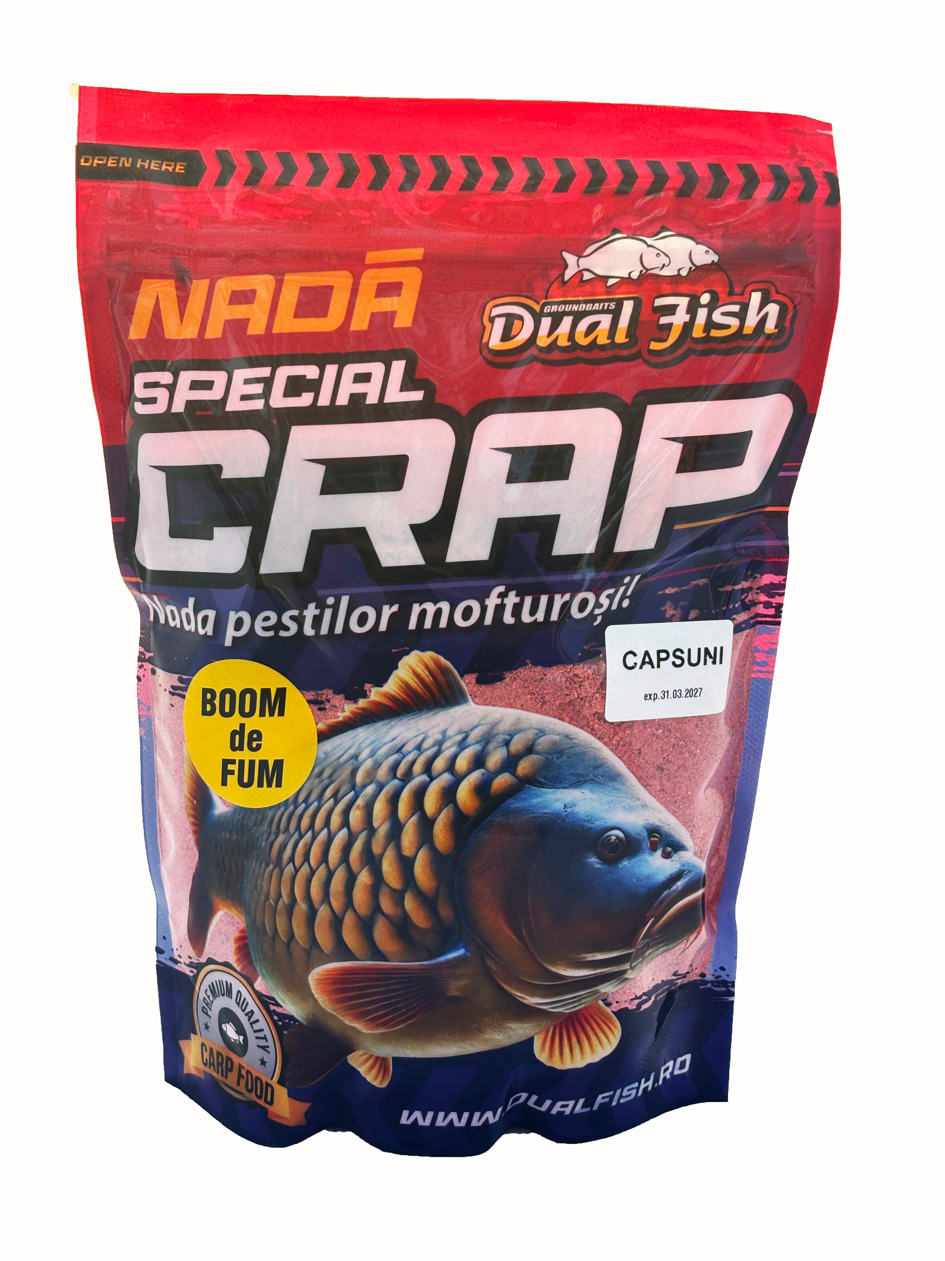 BOOM DE FUM- NADA SPECIAL CRAP! Nada BOOM DE FUM Special Crap are o granulatie grunjoasa si contine un mix de peleti, fiind folosita in pescuitul crapului. Ceea ce o face cu totul speciala este faptul ca este fumigena, oferind un BOOM DE FUM la fiecare partida. Se aplica direct pe momitor sau se formeaza bulgari. Mod de preparare: Continutul se goleste intr-o galeata si se amesteca, turnand apa. Pentru obtinerea consistentei dorite se recomanda 2-3 pauze a cate 10 minute in adaugarea apei. Inainte de formarea pe momitor sau la formarea de bulgari, se trece printr-o sita pentru o omogenizare mai buna. Se poate adauga si amesteca cu momeala vie, precum: rame, viermusi, larve. ✅ Caracteristici: - nada FUMIGENA - destinata apelor dulci - speciala pentru pescuitul crapului - se aplica pe momitor - aroma: CAPSUNI - 1kg