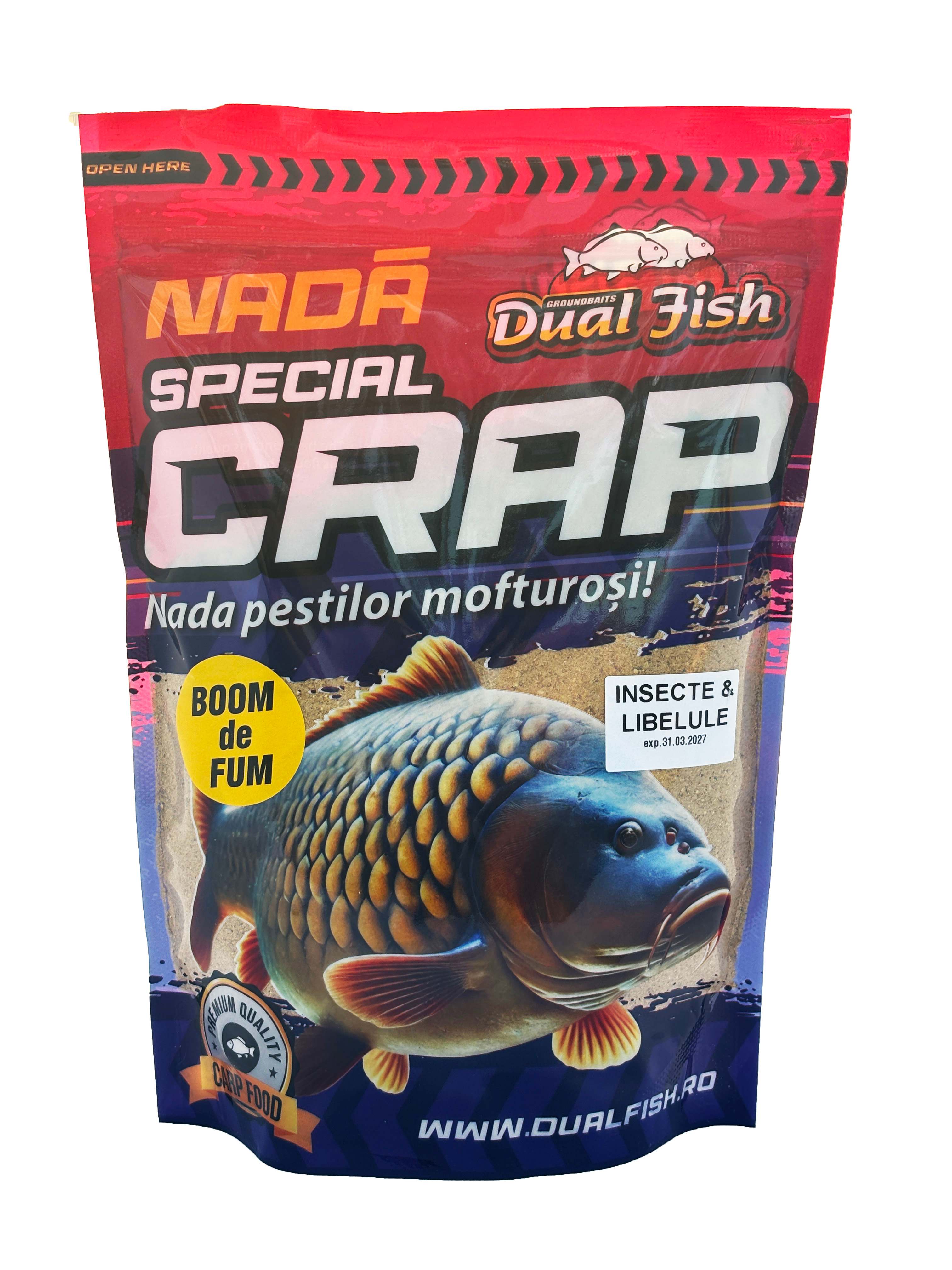 BOOM DE FUM- NADA SPECIAL CRAP! Nada BOOM DE FUM Special Crap are o granulatie grunjoasa si contine un mix de peleti, fiind folosita in pescuitul crapului. Ceea ce o face cu totul speciala este faptul ca este fumigena, oferind un BOOM DE FUM la fiecare partida. Se aplica direct pe momitor sau se formeaza bulgari. Mod de preparare: Continutul se goleste intr-o galeata si se amesteca, turnand apa. Pentru obtinerea consistentei dorite se recomanda 2-3 pauze a cate 10 minute in adaugarea apei. Inainte de formarea pe momitor sau la formarea de bulgari, se trece printr-o sita pentru o omogenizare mai buna. Se poate adauga si amesteca cu momeala vie, precum: rame, viermusi, larve. ✅ Caracteristici: - nada FUMIGENA - destinata apelor dulci - speciala pentru pescuitul crapului - se aplica pe momitor - aroma: INSECTE SI LIBELULE - 1kg