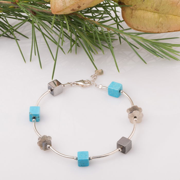 Bratara handmade cu tuburi curbe din argint, cuburi de turcoaz (6 mm) si cuburi de hematit argintiu mat si lucios (6 mm). Mai contine placute de labradorit si 3 piese din argint in forma de floare. Incuietoare si lant prelungitor din argint cu terminatie...
