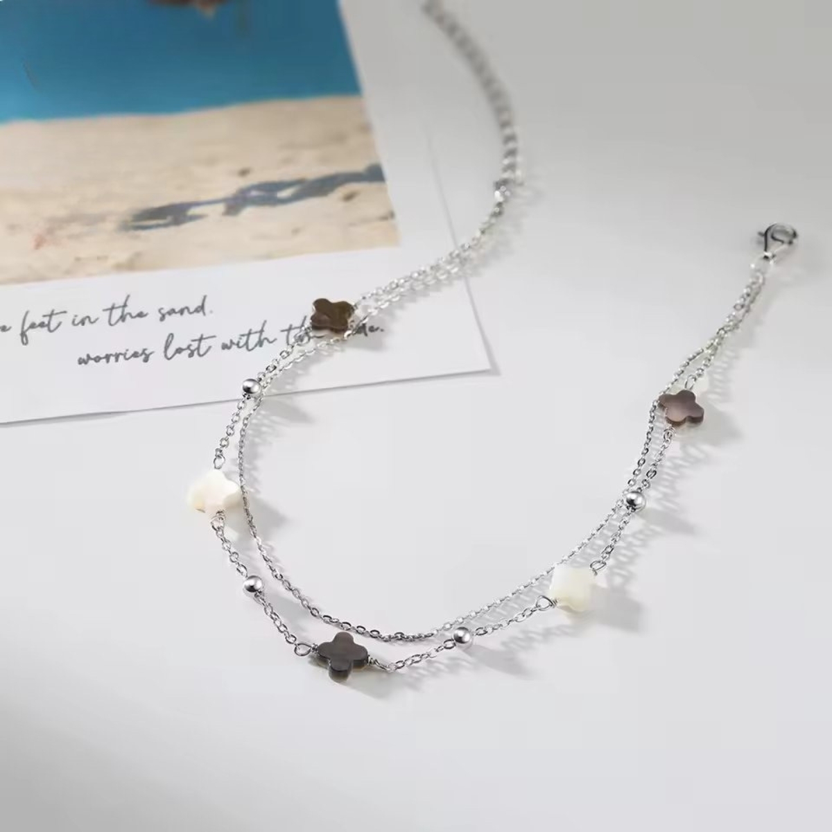 inchidere clasica; greutate: 2.44 g; grosim lant: 0.1 cm; dimensiune trifoi: 0.7 cm; scoica naturala; lungime bratara reglabila: 21.5 + 5 cm; finisaje premium, de lux. Ingrijirea bijuteriilor : Dupa purtare va recomandam sa pastrati bijuteriile in ambalajul original sau intr-un saculet dintr-un material moale, pentru a evita zgarieturile. Pentru a le reda stralucirea este necesar sa le stergeti cu o carpa moale sau cu solutii speciale pentru curatarea argintului. Inainte de culcare, baie sau activitati similare in care bijuteriile ar intra in contact cu apa, produse cosmetice, detergenti, corozive sau chimice, scoateti bijuteriile deoarece aceste produse pot decolora sau modifica stralucirea. Evitati loviturile bruste deoarece ar putea cauza zgarieturi, ciobiri si alte daune si nu lipiti cristalele dezlipite cu adezivi tip super glue, picatura sau orice alt tip.