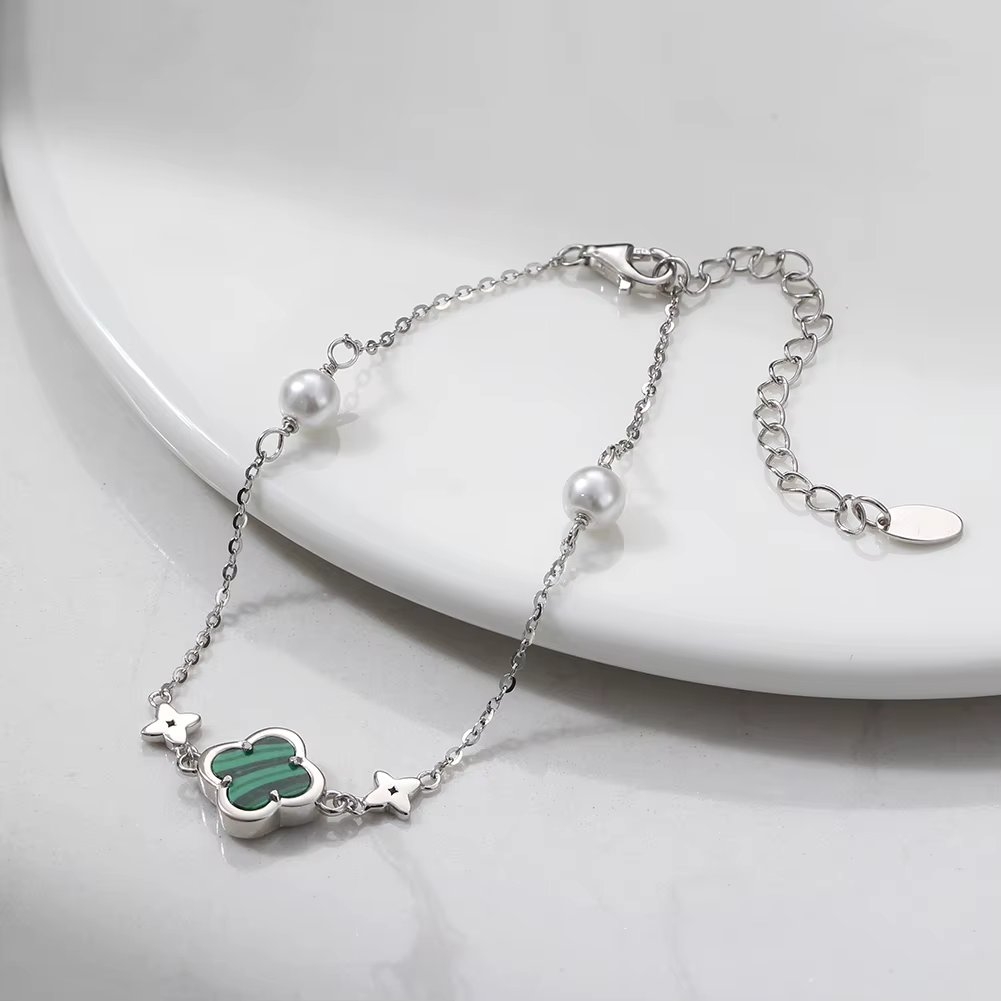 material: Argint 925 placat cu rodiu; grosime bratara: 1 mm; lungime bratara: 16.5 + 5 cm; perla naturala de apa dulce; dimensiune perla: 5 mm; dimensiune trifoi: 10 mm; gramaj aprox.: 2.73 g; finisaje premium, de lux. Ingrijirea bijuteriilor : Dupa purtare va recomandam sa pastrati bijuteriile in ambalajul original sau intr-un saculet dintr-un material moale, pentru a evita zgarieturile. Pentru a le reda stralucirea este necesar sa le stergeti cu o carpa moale sau cu solutii speciale pentru curatarea argintului. Inainte de culcare, baie sau activitati similare in care bijuteriile ar intra in contact cu apa, produse cosmetice, detergenti, corozive sau chimice, scoateti bijuteriile deoarece aceste produse pot decolora sau modifica stralucirea. Evitati loviturile bruste deoarece ar putea cauza zgarieturi, ciobiri si alte daune si nu lipiti cristalele dezlipite cu adezivi tip super glue, picatura sau orice alt tip.