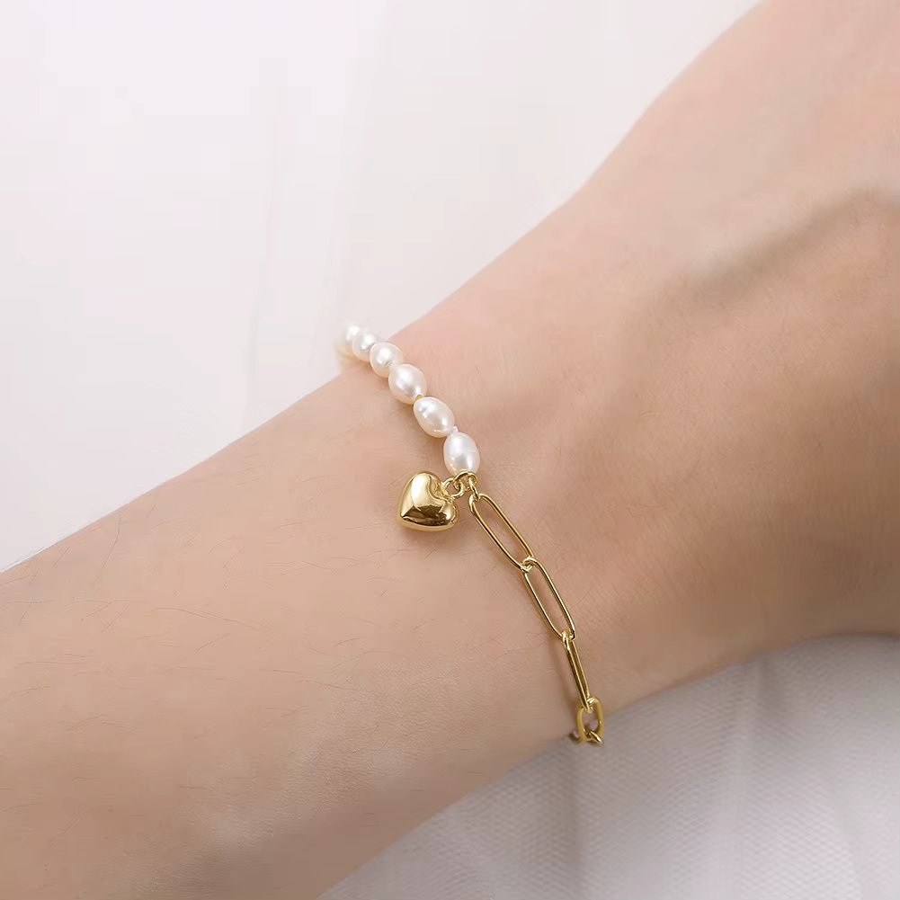material: Argint 925 placat cu aur; grosime bratara: 0.3 cm; lungime ajustabila: 16 + 5 cm; gramaj aprox.: 5.15 g; dimensiune perla: 0.5 cm; dimensiune inima: 0.8 cm; perla naturala de apa dulce; finisaje premium, de lux. Ingrijirea bijuteriilor : Dupa purtare va recomandam sa pastrati bijuteriile in ambalajul original sau intr-un saculet dintr-un material moale, pentru a evita zgarieturile. Pentru a le reda stralucirea este necesar sa le stergeti cu o carpa moale sau cu solutii speciale pentru curatarea argintului. Inainte de culcare, baie sau activitati similare in care bijuteriile ar intra in contact cu apa, produse cosmetice, detergenti, corozive sau chimice, scoateti bijuteriile deoarece aceste produse pot decolora sau modifica stralucirea. Evitati loviturile bruste deoarece ar putea cauza zgarieturi, ciobiri si alte daune si nu lipiti cristalele dezlipite cu adezivi tip super glue, picatura sau orice alt tip.