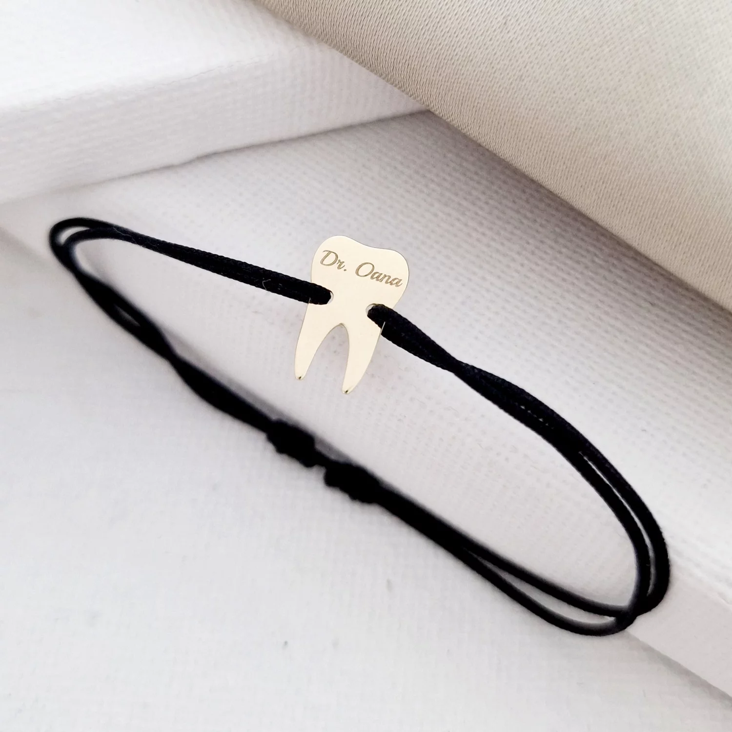 Se zice ca un mar pe zi tine dentistul la distanta, dar noi va recomandam sa il tineti aproape de voi cu un cadou simpatic si de efect: o bratara dinte pe care puteti alege sa o personalizati prin gravarea numelui sau initialelor. Un cadou minunat pentru un student de la medicina dentara sau pentru doctorul din viata ta! Bratara este creata din Aur Galben de 14K prin taiere si gravare laser, avand dimensiunea de 8x12 mm si fiind atasata unui snur din matase vegetala, marime reglabila. Gramaj aproximativ AUR 585:0.25-0.28 grame Aceasta bijuterie personalizata este realizata de la zero pentru fiecare comanda in parte. Dupa plasarea si confirmarea comenzii incepe procesul ei de creatie: Realizare Design -> Taiere/Personalizare -> Finisare manuala -> Polish Final -> Ambalare -> Livrare! Datorita procesului de productie si a personalizarii bijuteriei dupa propria dorinta gramajul final al produsului poate fi diferit. Din acest motiv pe site este afisat gramajul obtinut prin catarirea produsului realizat in pozele de prezentare. Pretul produsului include pe langa costul gramului de AUR 585 si tot procesul de mai sus, necesar pentru realizarea unui produs cu adevarat special pentru tine. Toate produsele din Aur comercializate de Chic Bijoux sunt marcate cu titlul Aurului de 14K · 585 ·