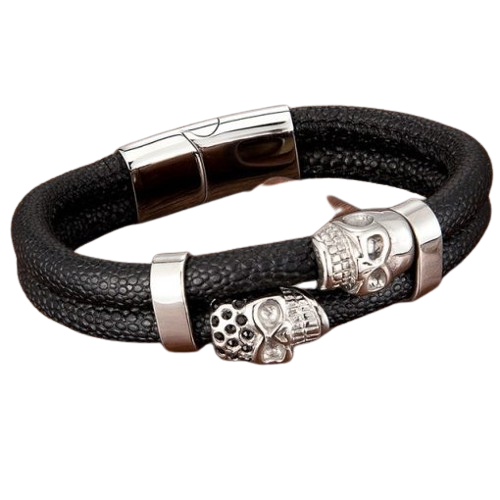 Bratara Double Skull, Barbati, Piele Naturala, Negru-Argintiu Engros