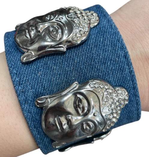 Bratara jeans cu 3 cap Buddha, dimensiuni: 5 x 21 cm- se potriveste marimile 16 - 19 cm