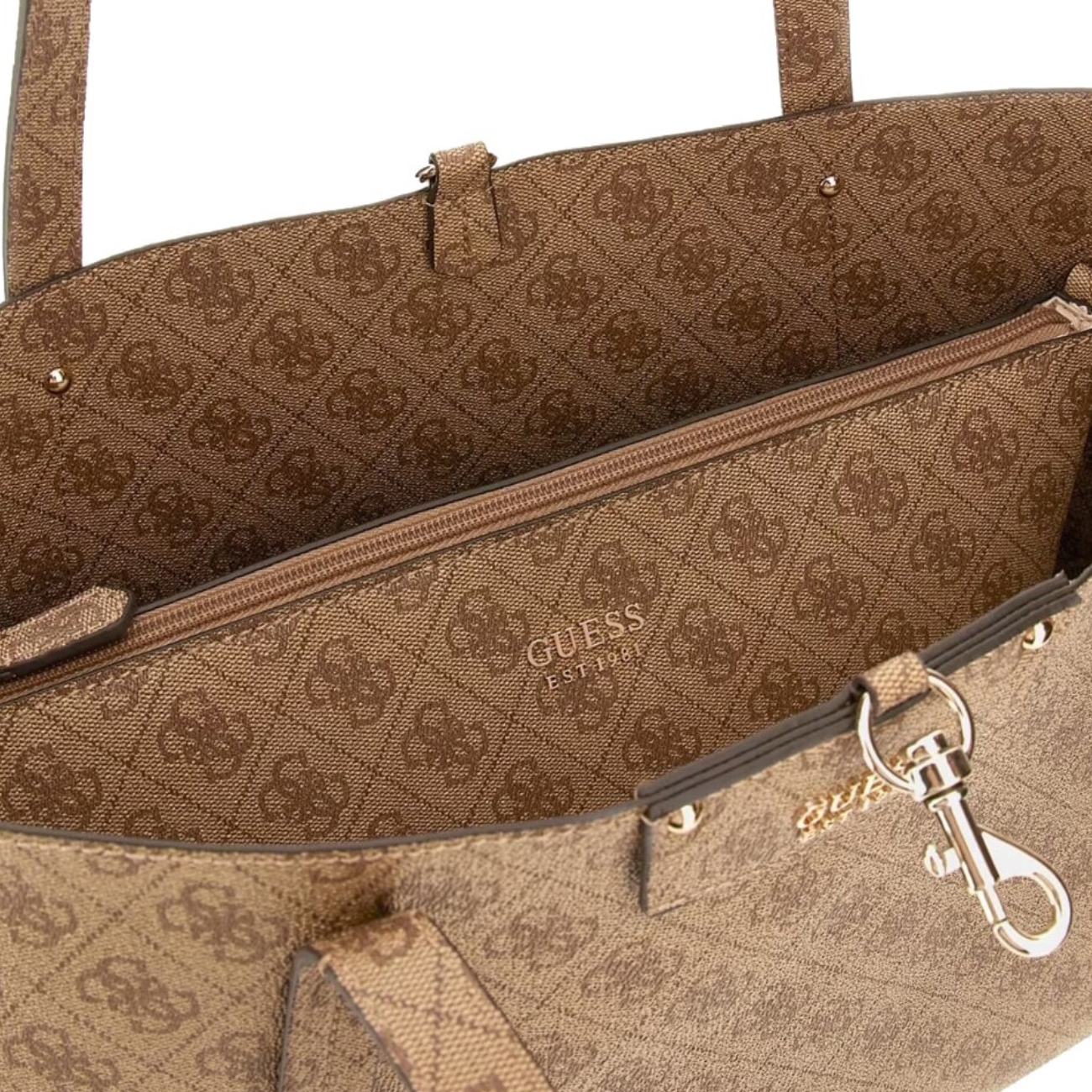 Geanta de mână Guess este realizată integral din poliuretan și se distinge prin imprimeul său monogramat cu logo-ul 4G repetitiv, emblematic pentru brand. Setul conține două genți asortate: o geantă tip shopper de mari dimensiuni, ideală pentru activitățile de zi cu zi, și o geantă de tip pouch cu curea detașabilă, perfectă pentru utilizare individuală sau ca organizator interior.