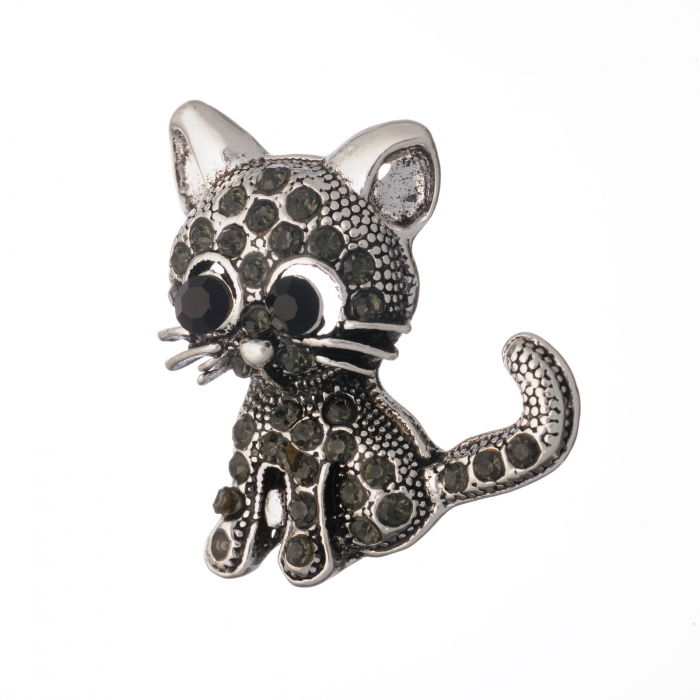 Brosa metalica argintie pui de pisicuta cu pietricele negre