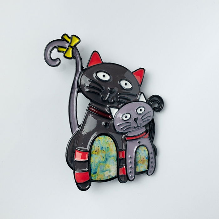 Brosa metalica neagra cu pisicuta si puiul ei, in nuante de gri