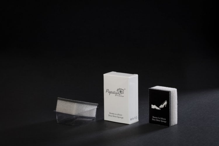 BURETE CU SILICON PAPATYA Buretele este îmbibat în silicon pentru curățare și pentru a conferi strălucire intensă pantofului. Buretele este fin și nu lasă urme de zgârieturi pe pantofi. Ambalat în cutiuță de carton. Ideal pentru camere de hotel și pensiuni.