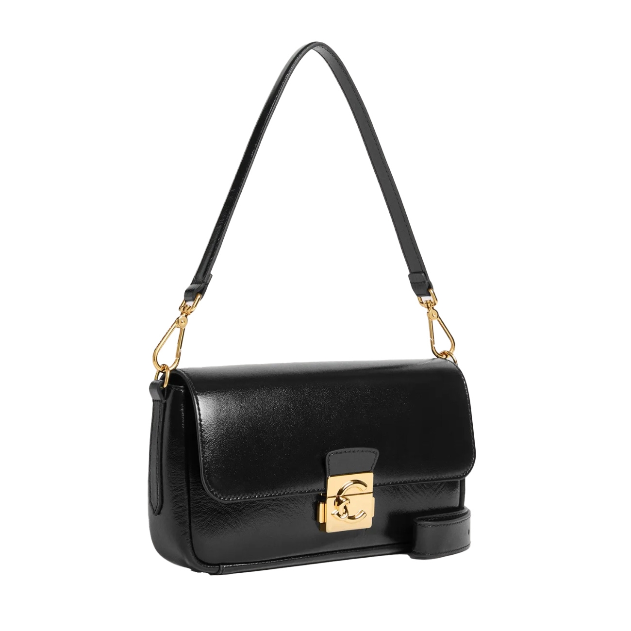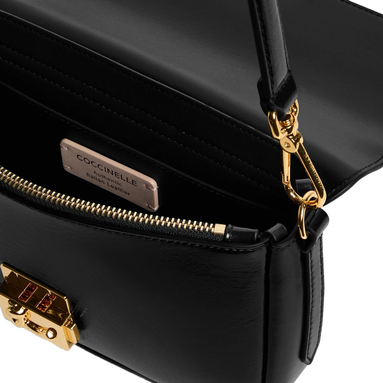 C-Me Lock Medium pune în valoare reinterpretarea modernă a logo-ului C Me, integrat într-un sistem de închidere distinctiv și funcțional. Realizată din piele netedă, cu finisaj lucios obținut printr-un strat transparent aplicat după vopsire, aceasta are un aspect uniform și plăcut la atingere. Designul este completat de închiderea Tuck Lock cu butoane laterale și detalii metalice cu finisaj auriu. Mânerul detașabil și cureaua textilă reglabilă permit purtarea pe umăr sau crossbody, iar interiorul cu două buzunare, dintre care unul cu fermoar, oferă organizare practică pentru utilizarea zilnică.