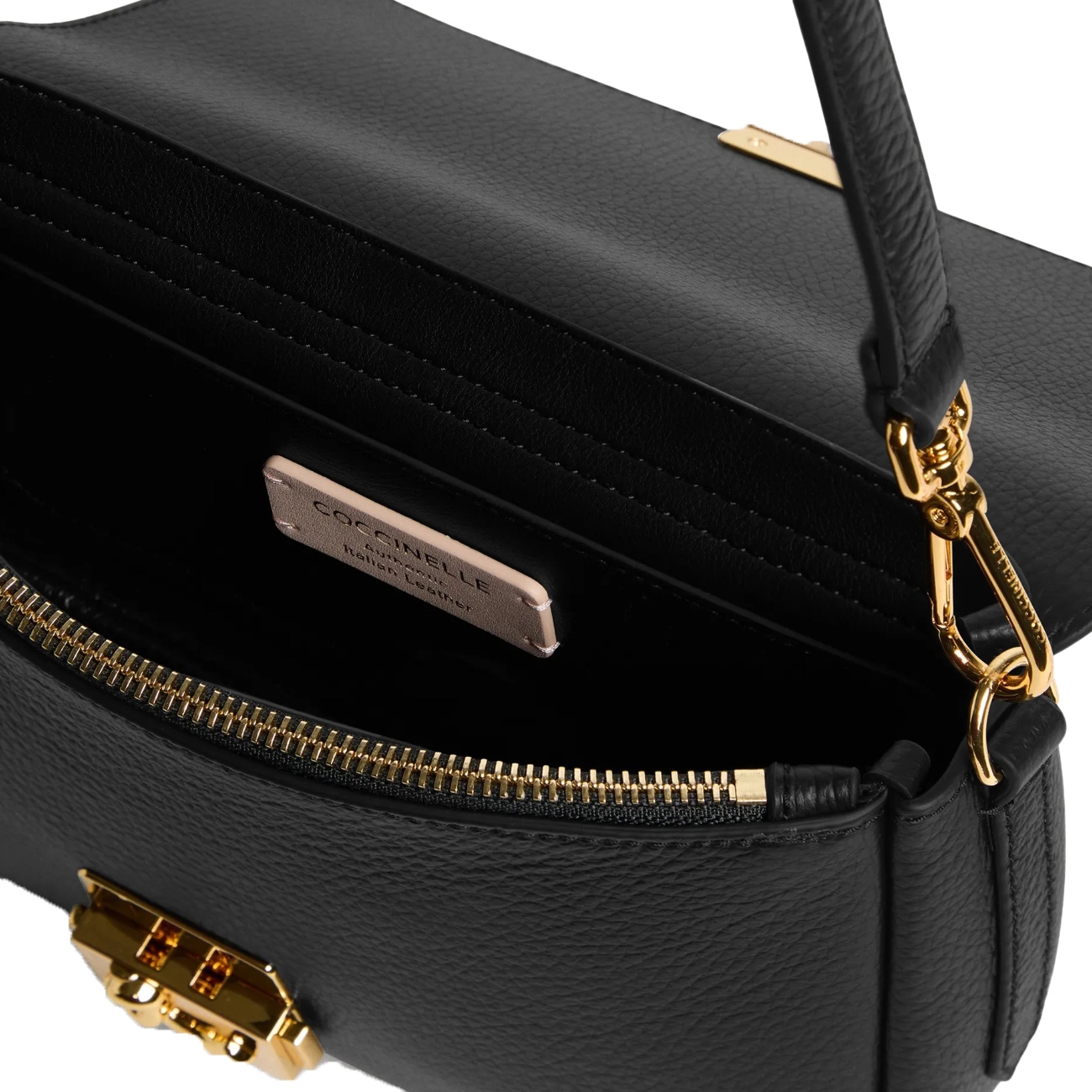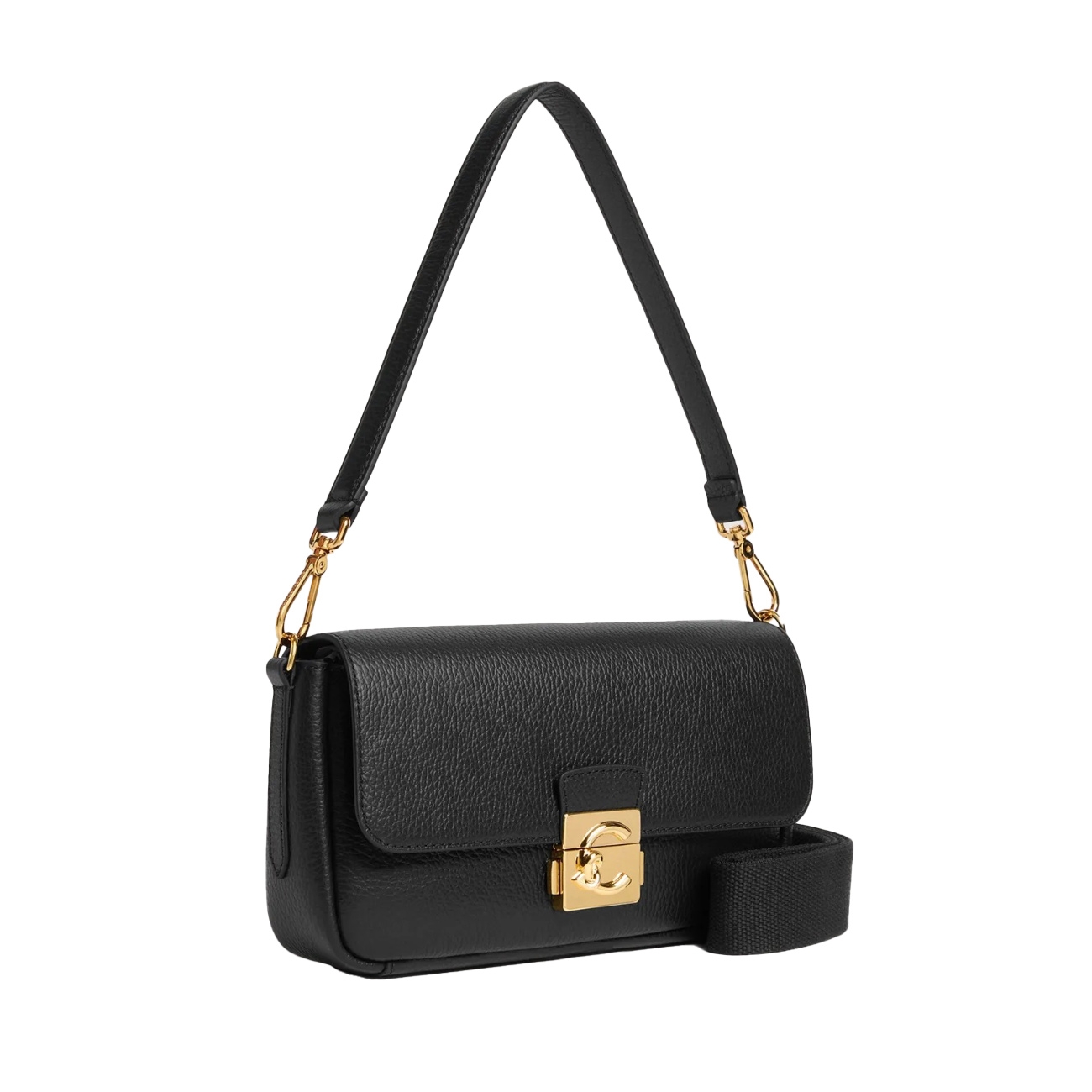 C-Me Lock Medium reinterpretă logo-ul emblematic într-o închidere modernă, cu un design echilibrat și funcțional. Realizată din piele embosată, rezistentă și ușor de întreținut, este potrivită pentru purtare zilnică. Silueta structurată este completată de detalii metalice cu finisaj auriu și de închiderea Tuck Lock cu butoane laterale. Mânerul detașabil și cureaua textilă reglabilă permit purtarea pe umăr sau crossbody, iar interiorul cu două buzunare, dintre care unul cu fermoar, asigură organizare practică.