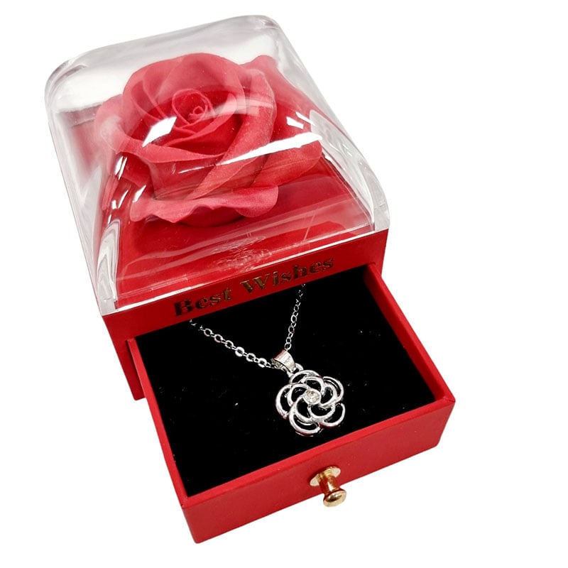 Cadou cu colier si trandafir de sapun in cutiuta Best Wishes , Marime trandafir -8 cm Marimea totala a cadoului -7 x 7.5 cm, Cadoul este ambalat intr-o cutie cu manere speciala pentru cadou, coliere din imagine pot fi diferite, Cutia cu trandafir este conceputa cu un sertar special cu o bijuterie ( Colier) pentru a fi oferita celor dragi ,cadoul mai detine si o punguta pentru cadou Mentionam! Coliere din cutie nu vor fi la fel pentru fiecare client, ele vin in bax cu modele diferite.