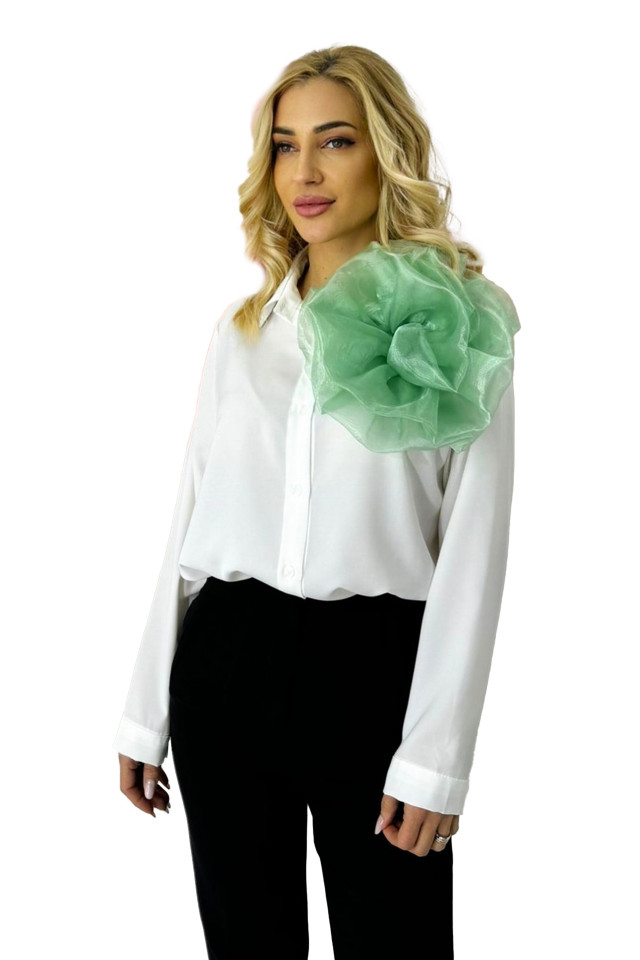 Camasa office Alizee, cu accesoriu floral din organza, Alb/Verde, Marime S/M