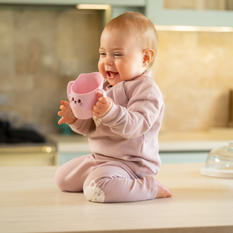 Cana antrenament cu manere pentru copii Akuku BabyMug Pink Cat,capacitate 150ml,materiale sigure fara BPA,margine tesita ce permite bautul fara a inclina capul pe spate,comptibil masina de vase