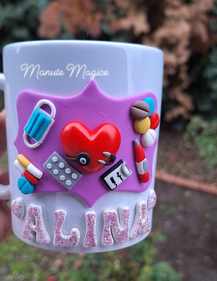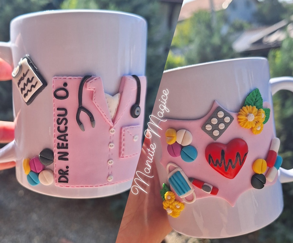 Un cadou unic pentru oamenii care au grijă de noi zi de zi! ❤️Această cană handmade este decorată manual din lut polimeric, cu detalii medicale realizate cu grijă – stetoscop, inimă, pastile, mască, flori și halat medical. Poate fi personalizată cu numele persoanei, funcția sau culoarea dorită, devenind un dar memorabil pentru medici, asistente sau farmaciști. ✨ Detalii produs: Material: ceramica+ decor din lut polimeric (handmade) Volum: aprox. 330 ml Personalizabilă cu nume sau meserie Realizată manual, cu atenție la fiecare detaliu Ideală pentru cadouri dedicate profesiilor medicale ? Fiecare cană este unică, lucrată manual, ceea ce îi oferă un farmec aparte și autentic. Perfectă pentru a aduce un zâmbet pe chipul celor care poartă halatul alb cu mândrie.