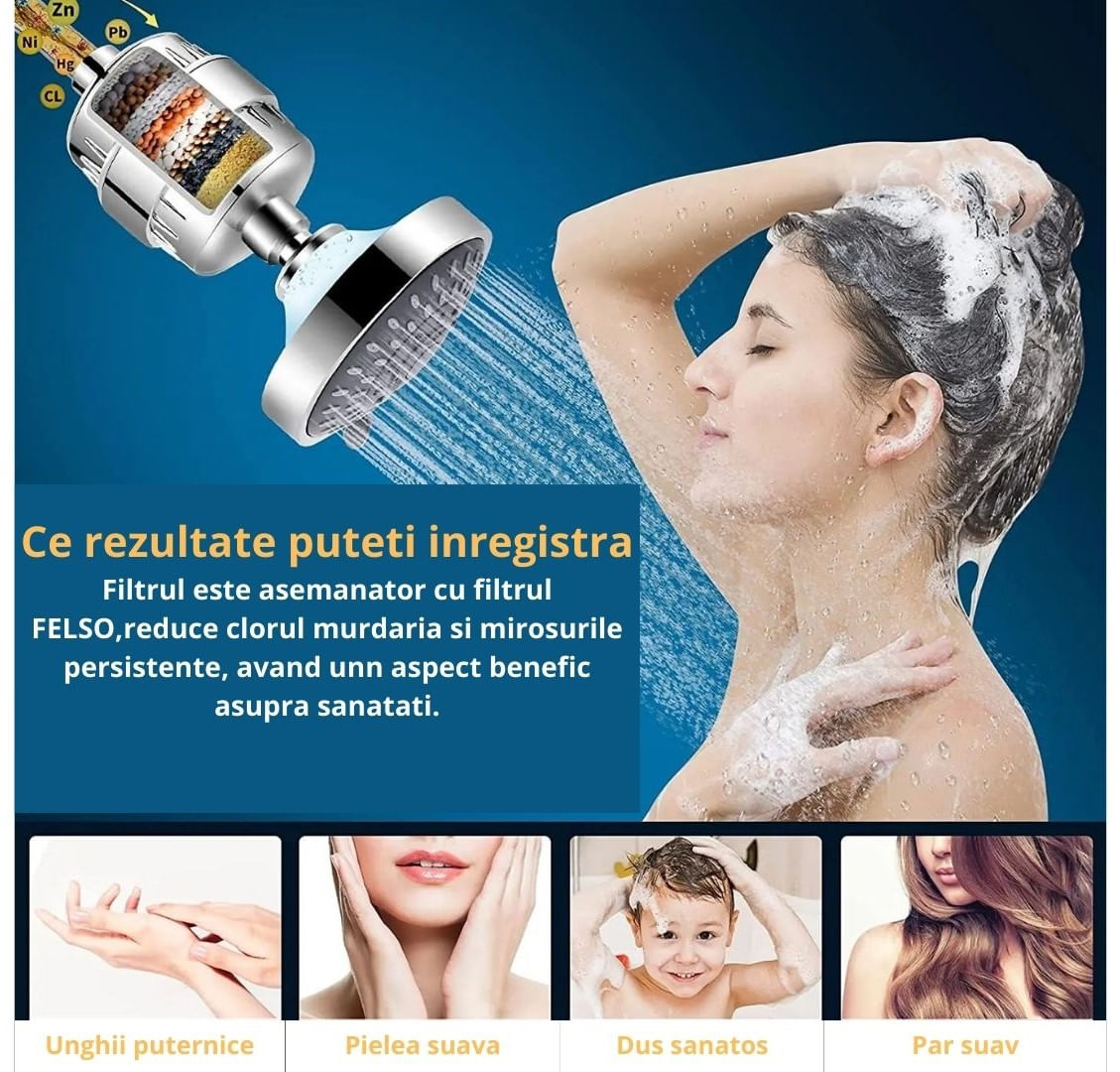 Cap de dus cu filtro incorporat, cu directia jetului ajustabila Video Cap de dus cu filtru incorporat modern cu o rotatie a capului de dus de 360º./nDisponibil in doua culori, in culoare crom argintie si in neagru mat, foarte elegant, si modern./nDirectia jetului ajustabila./nFiltrul are 15 etape de filtrare a apei, si capul de dus are 4´ in grosime./nApa filtrata de acest filtru este foarte suava/nStimuleaza sistemul imunitar/nElimina toxinele si impuritatiile secretate de piele/nDezinfecteaza apa/nApa contine mai mult oxigen/nElimina orice miros persistent, si dezinfecteaza apa inainte de a atinge pielea./nEste o protectie única pentru toata familia in special pentru pielea bebelusilor/nEste apt pentru orice tip de dus, se instaleaza foarte usor./nSimti cum acest cap de dus cu filtru incorporat, reduce clorul, murdaria, si elimina orice miros, avand un mare beneficiu asupra corpului dumneavoastra./nCapul de dus are 5 trepte de presiune a apei./nAcest model dispune de o inovatie noua a supapelor, se utilizeaza o tecnologie avansata de ultrasonic pentru fabricarea acestora, cu un disaign ultra fin de numai 6 mm grosime, cu un jet de sprai al apei confortabil, suav si catifeltat, efect ESPA.