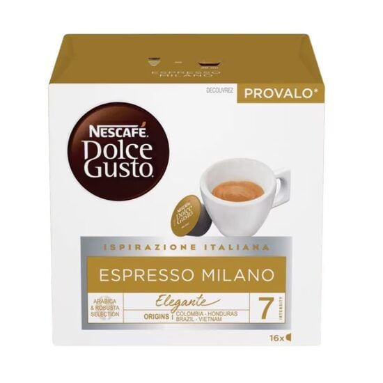Bucura-te de arome intense si de o experienta autentica a cafelei italiene cu capsulele Nescafe Dolce Gusto Espresso Milano. Acest espresso se remarca prin gustul sau bogat si robust, cu note subtile de ciocolata si nuci. Fie ca il savurezi dimineata pentru a-ti incepe ziua sau dupa-amiaza pentru o pauza revitalizanta, Nescafe Dolce Gusto Espresso Milano te va impresiona cu aroma sa plina si cu crema bogata. Compatibil cu sistemul Dolce Gusto, aceste capsule asigura o preparare rapida si usoara, pentru o cafea perfecta in fiecare zi