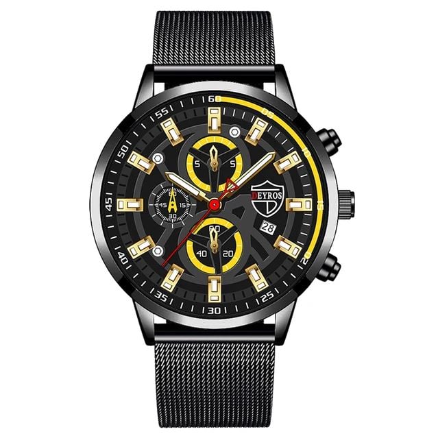 Ceas Deyros, Luxury Mesh, Curea subtire, Barbati, Cronograf, Calendar, Negru/Galben/Auriu Engros