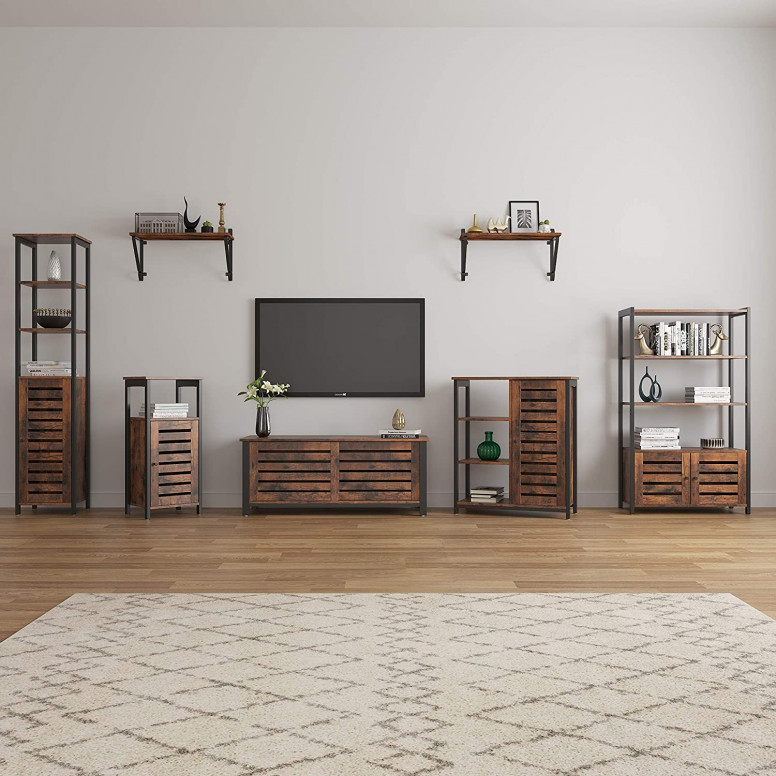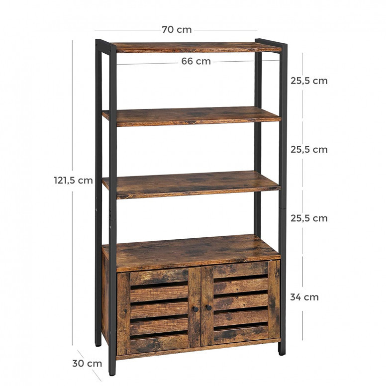 Specificații: - Culoare: Maro rustic - Material: Plăci PAL, metal - Dimensiune produs: 70 x 30 x 121,5 cm (L x l x H) - Greutate produs: 19 kg - Max Capacitate de încărcare statică: Suprafața superioară: 20 kg Rafturi deschise: 20 kg fiecare Dulap interior: 15 kg Conținutul pachetului: - 1 x dulap de depozitare - 1 x kit de accesorii (instrument de asamblare inclus) - 1 x instrucțiuni (EN, DE, FR, ES) , ACEASTA)