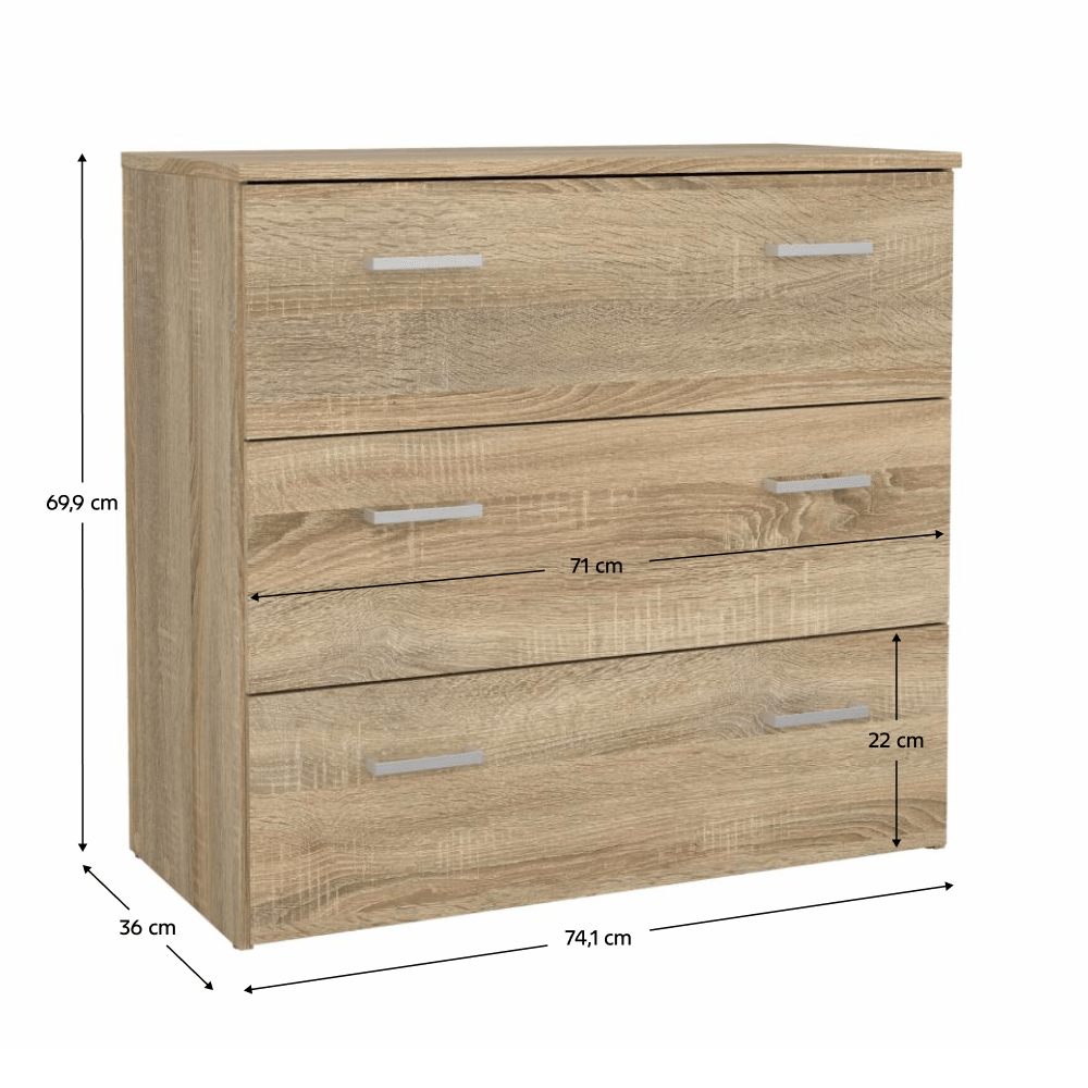 Comoda GARBO 3, Material: PAL melaminat Finisaj: stejar sonoma Dimensiuni comoda (lxhxA): 74,1x69,9x36 cm Dimensiuni sertare (lxh): 71x22 cm Grosimea materialului corpului: 12 mm Grosimea materialului blatului superior: 15 mm 3 sertare