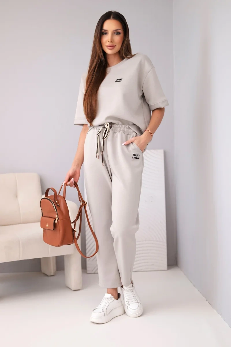 Compleu bej din vascoza cu top cu maneca scurta si pantaloni cu snur, alegerea perfecta pentru un look relaxat si modern in zilele de vara. Setul este format dintr-un top lejer cu maneci scurte si pantaloni lungi cu talie elastica, ajustabili prin snur co