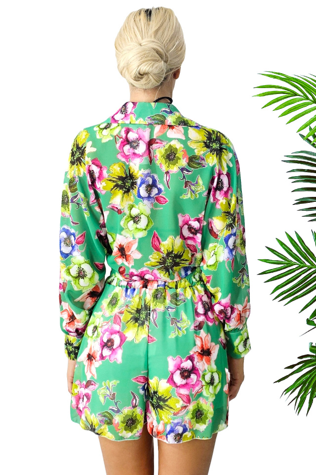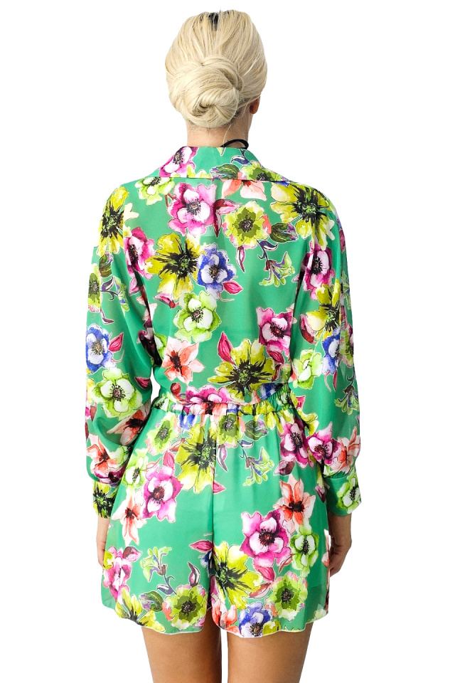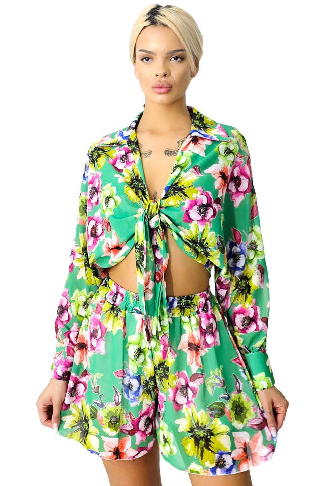 Compleu estival AdeLLa, cu camasa vaporoasa si pantaloni scurti, Verde, Marime S/M