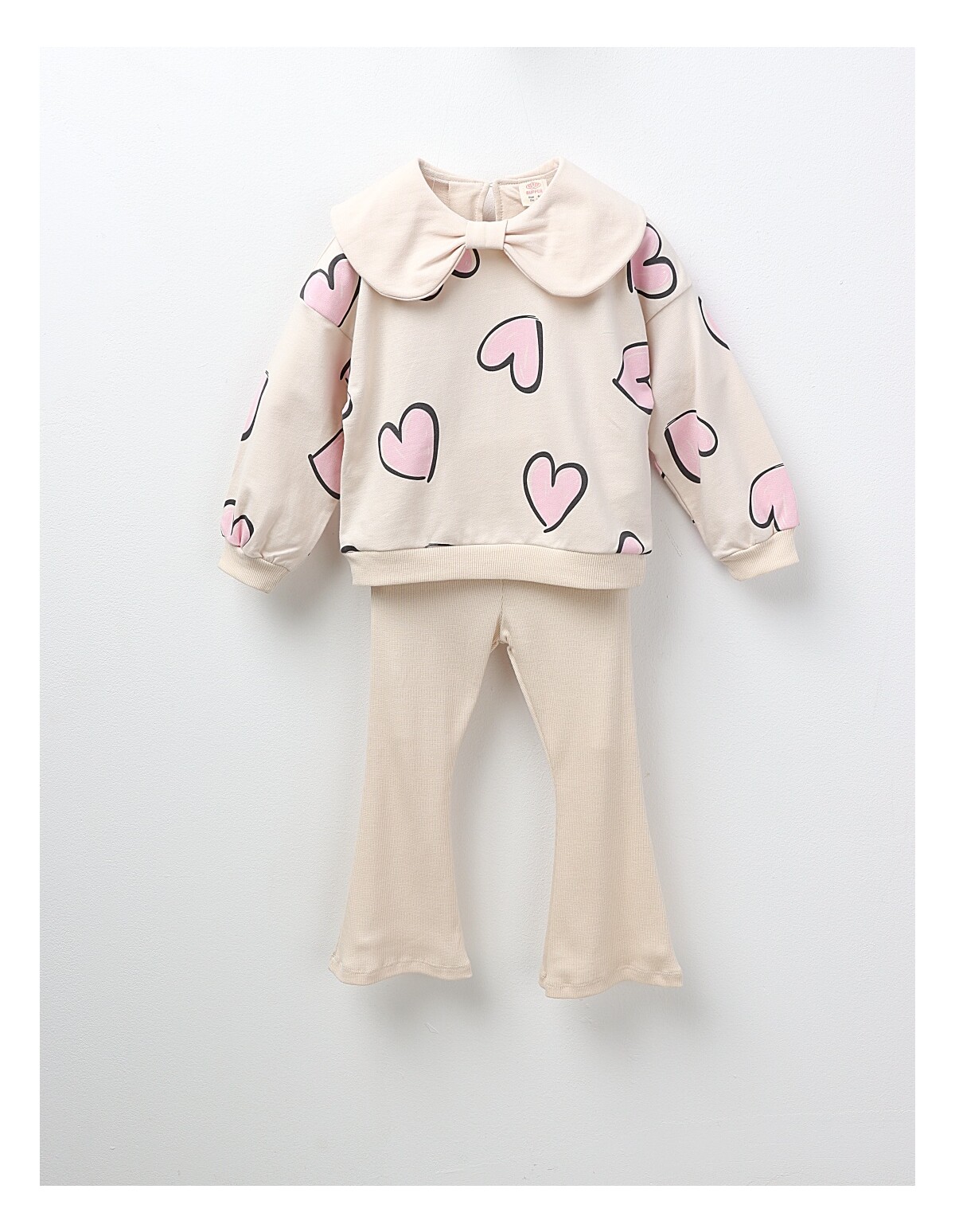 Compleu pentru fetițe 3–7 ani, format din două piese: bluză cu mânecă lungă, guler tip fundiță și deschidere cu nasture la spate, și colanți evazați pentru un look delicat. Confecționat 100% bumbac, fabricat în Turcia, oferind confort, respirabilitate și libertate de mișcare. Croiala elegantă, dar practică, îl face potrivit atât pentru joacă, cât și pentru ocazii speciale.