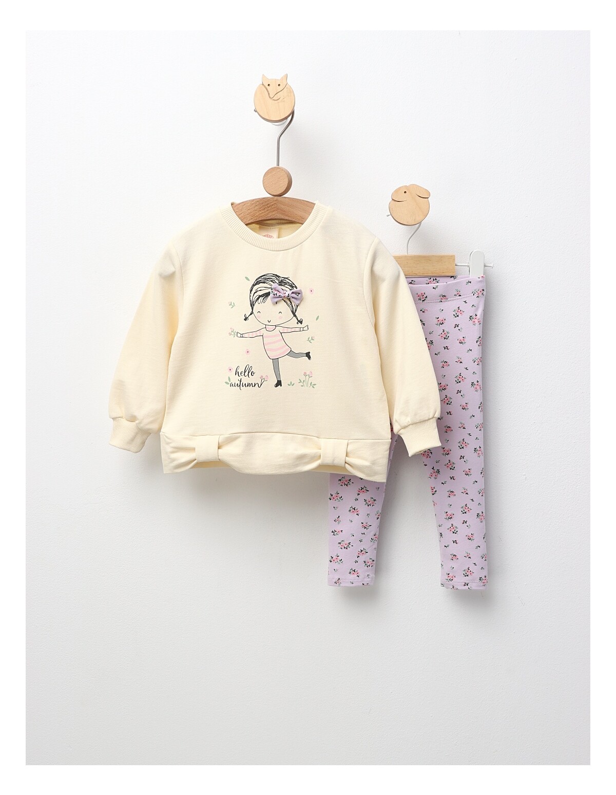 Compleu pentru fetițe 1–4 ani, format din două piese: bluză cu mânecă lungă decorată cu imprimeu cu fetiță și colanți cu imprimeu cu floricele. Confecționat 100% bumbac, fabricat în Turcia, asigură moliciune, respirabilitate și confort pentru pielea delicată. Croiala lejeră permite libertate de mișcare, ideal pentru joacă zilnică și activități casual.