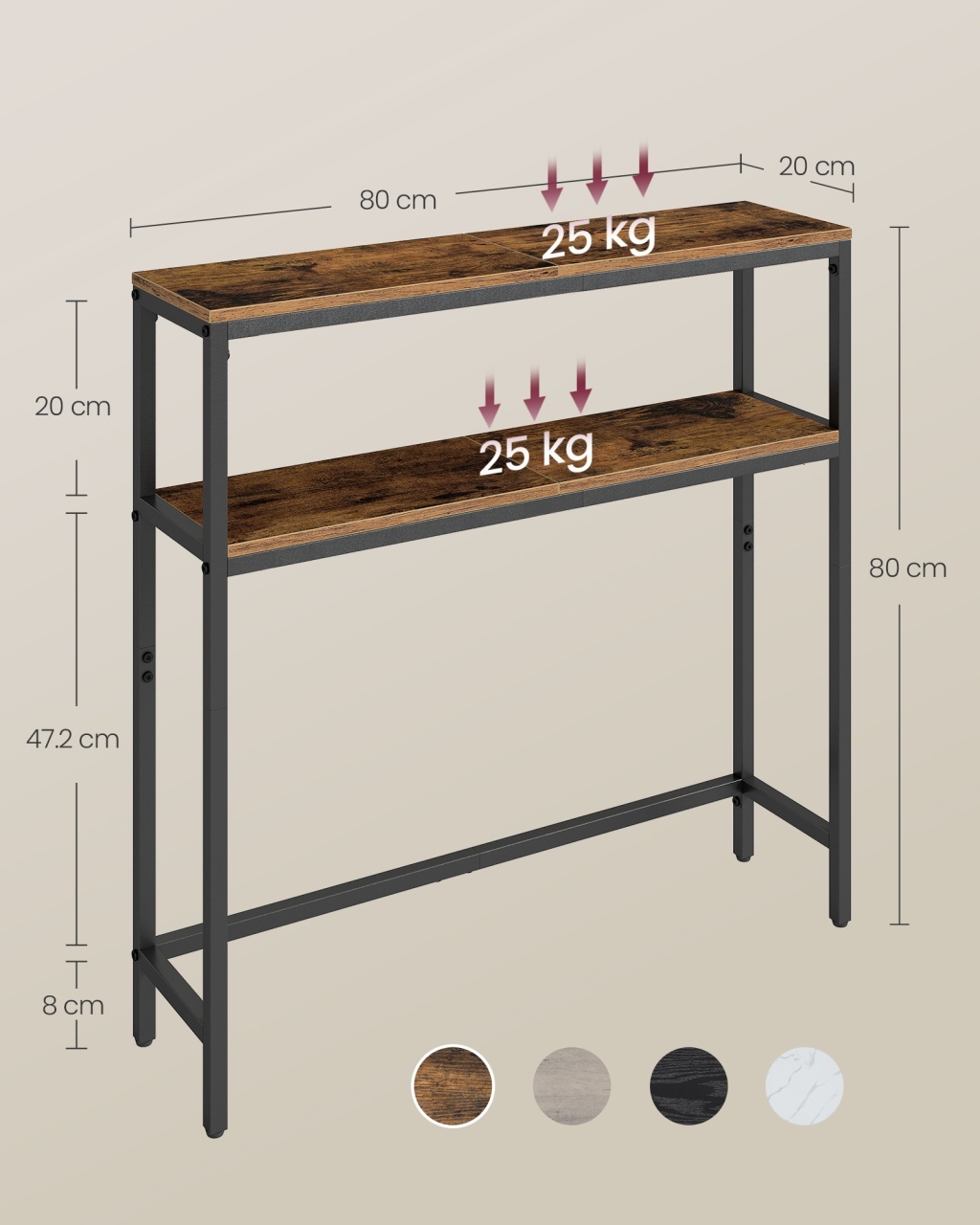 Consola Sofia — Eleganță rustică, compactă și practică pentru hol și living Design și materiale de calitate Consola Sofia îmbină un cadru negru subțire cu panouri cu finisaj rustic , creând o notă caldă și reconfortantă în orice colț. Panourile sunt realizate din Lemn PAL , iar structura din Metal , în timp ce elementele secundare sunt concepute pentru durabilitate din Lemn MDF . Panourile provin din lemn certificat FSC (FSC = Forest Stewardship Council, Consiliul pentru Gestionarea Responsabilă a Pădurilor), o garanție a provenienței responsabile. Funcționalitate și organizare Cu o amprentă îngustă de doar 20 x 80 x 80 cm, această consolă oferă spațiu eficient pe două niveluri pentru chei, obiecte decorative sau mici plante. Cele două rafturi suprapuse asigură o organizare ordonată și permit afișarea obiectelor favorite, în timp ce picioarele reglabile sporesc stabilitatea pe pardoseli ușor inegale. Dimensiunile compacte o fac ideală pentru holuri sau colțuri înguste, oferind în același timp versatilitate în aranjare. Montaj și întreținere Montajul este simplu, cu piese etichetate și instrucțiuni clare; pachetul include un set de accesorii de montaj și un Anti-Tip Kit pentru fixare anti-răsturnare. Curățarea se face ușor cu o lavetă moale , iar finisajul rustic necesită doar întreținere minimală pentru a-și păstra farmecul. Pentru confort și siguranță, picioarele reglabile permit adaptarea la podele neregulate. Comandă acum și transformă-ți spațiul! Alege Consola Sofia pentru un colț cu personalitate: adaugă acum o piesă care combină stil și practic în holul sau livingul tău. Detalii tehnice complete Dimensiuni și greutate Dimensiuni produs: 20 x 80 x 80 cm Greutate produs: 6.4 kg Capacitate maximă de susținere: 25 kg (blat) / 25 kg (raft inferior) Materiale și caracteristici Material corp: Lemn PAL / Lemn MDF / Metal Material finisaj/tapițerie: Finisaj rustic maro Culoare: Maro Număr pachete: 1 Montaj și pachet Stare asamblare: Neasamblat Conținut pachet: 1 x Consola, Accesorii de montaj, Anti-Tip Kit, Instrucțiuni Stil și origine Stil: Modern Destinație recomandată: Hol, Living