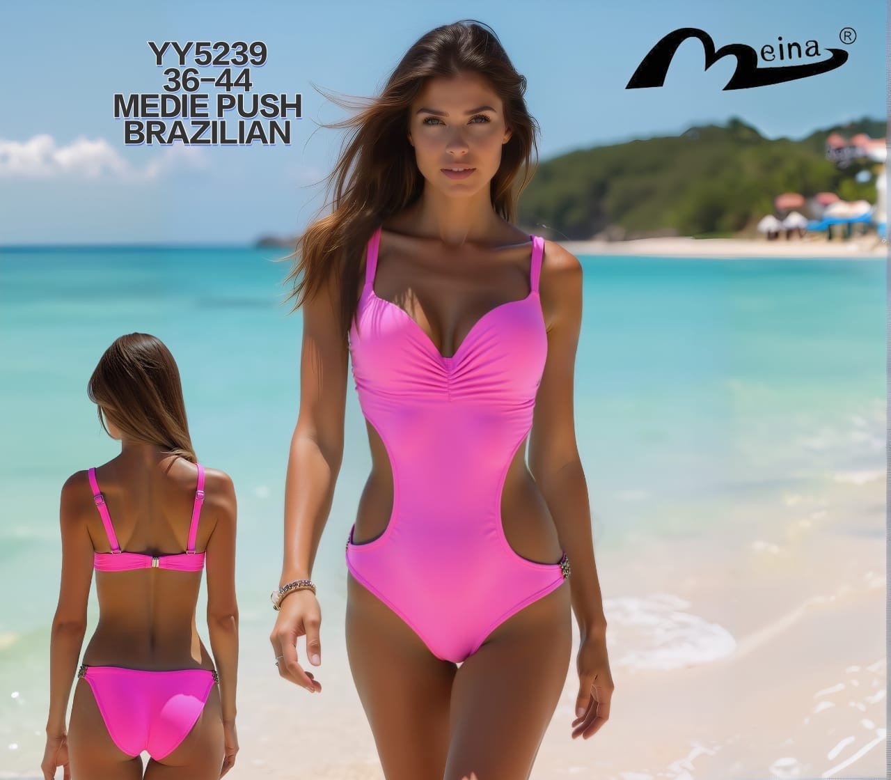Costum de baie dintr o piesa Adauga culoare și stil verii tale cu acest costum de baie modern și elegant! Realizat din materiale de calitate superioară, acest model în două piese combină un imprimeu cu accente clasice negre – perfect pentru un look fresh și atrăgător pe plajă sau la piscină.Sutienul are cupe moi, bretele care se leagă după gât și un nod decorativ în față, pentru un plus de stil și susținere. Slipul cu talie medie este prevăzut cu o bandă lată imprimată, care accentuează talia și oferă un plus de confort. Detalii produs: • Două piese: sutien și slip • Imprimeu american • Sutien cu prindere după gât și nod decorativ frontal • Slip cu talie medie și bandă lată • Material elastic, confortabil și rezistent la apă sărată sau clor.Compoziție: 82% poliamidă, 18% elastan.Îngrijire: Spălare manuală recomandată pentru a păstra intensitatea culorilor