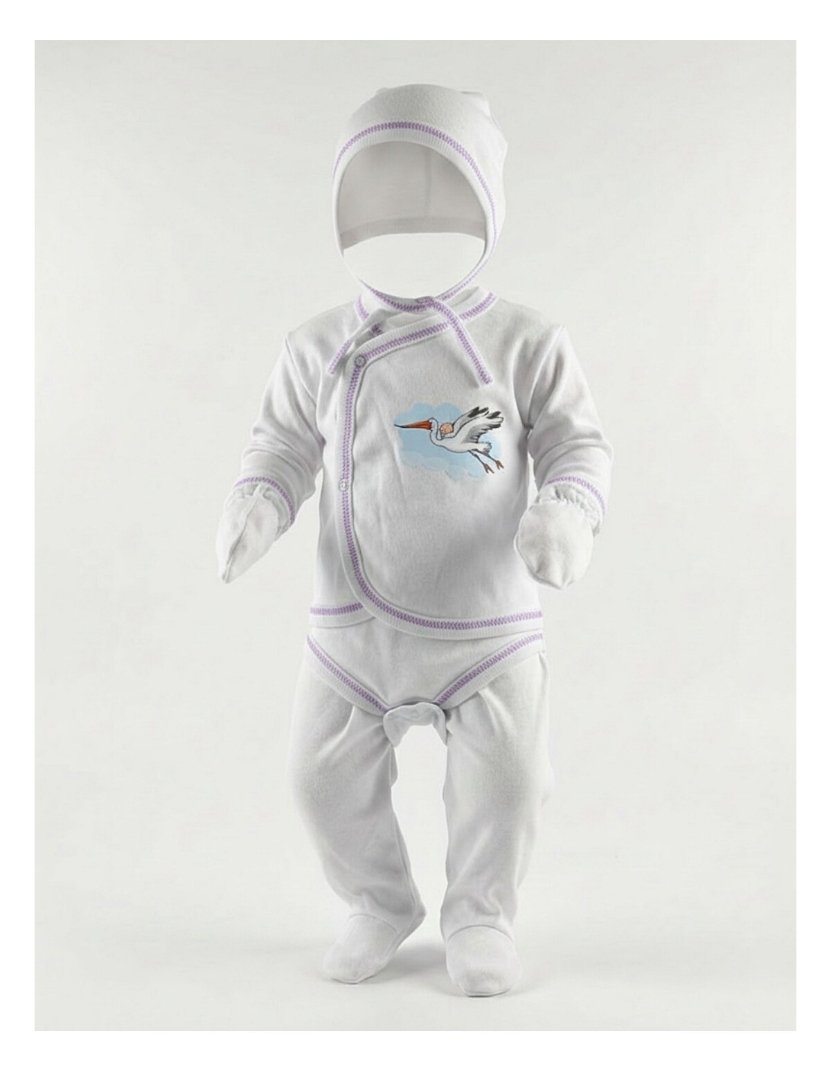 Acest costum pentru bebelusi este alcatuit din 6 piese esentiale pentru ingrijirea si confortul acestuia: o bluzita cu deschidere in capse, pantalonasi cu botosei, un body maiou, o bavetica, o caciulita si manusi. Toate aceste piese sunt realizate din material 100% bumbac, care este bland si confortabil pe pielea sensibila a bebelusului. Produsul a fost fabricat in Romania cu atentie la detalii si calitate.