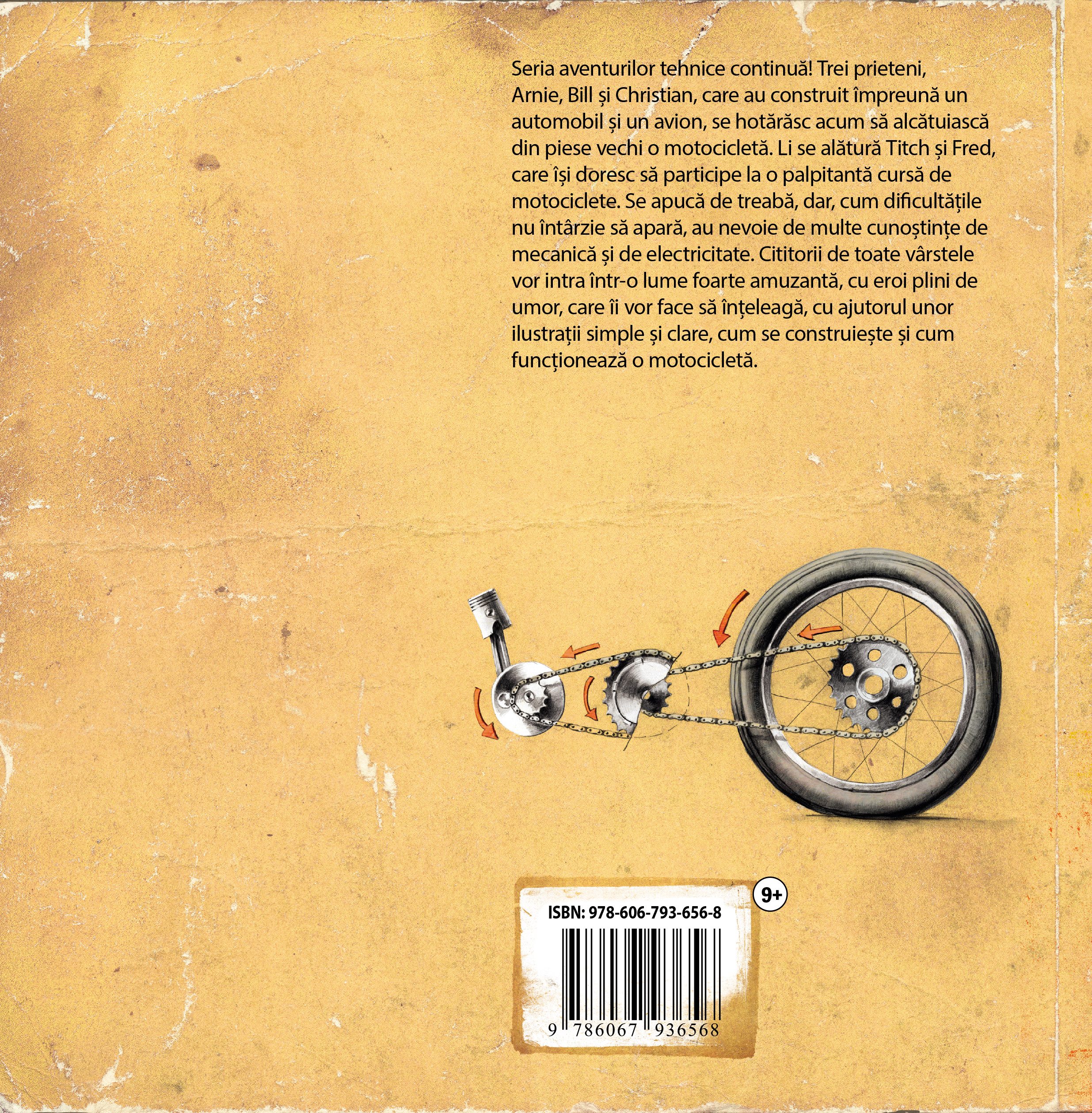 Seria aventurilor tehnice continuă! Trei prieteni, Arnie, Bill și Christian, care au construit împreună un automobil și un avion, se hotărăsc acum să alcătuiască din piese vechi o motocicletă. Li se alătură Titch și Fred, care își doresc să participe la o palpitantă cursă de motociclete. Se apucă de treabă, dar, cum dificultățile nu întârzie să apară, au nevoie de multe cunoștințe de mecanică și de electricitate. Cititorii de toate vârstele vor intra într-o lume foarte amuzantă, cu eroi plini de umor, care îi vor face să înțeleagă, cu ajutorul unor ilustrații simple și clare, cum se construiește și cum funcționează o motocicletă.